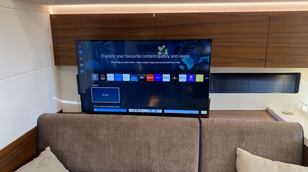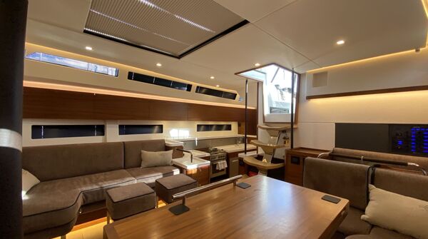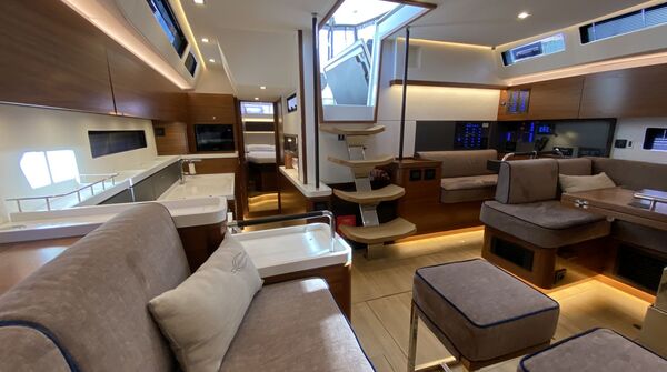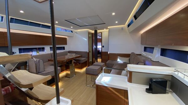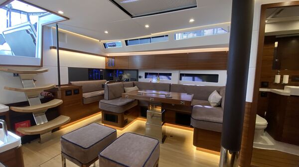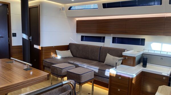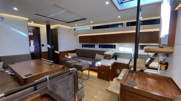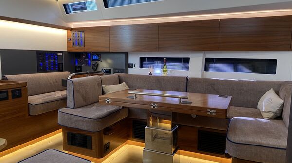 - Großzügiger, geräumiger Salon mit U-förmiger Sitzgruppe an Backbord