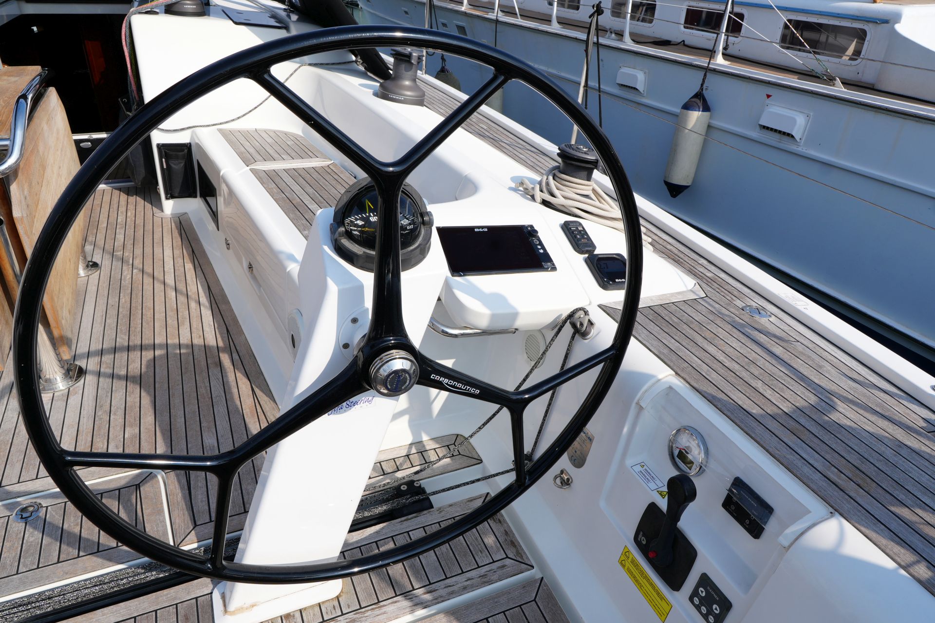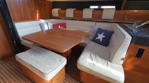 - Geräumiges Cockpit mit zwei Steuerständen, schwarz lackierten GFK-Steuerrädern und großen Konsolen für Navigations-Instrumente