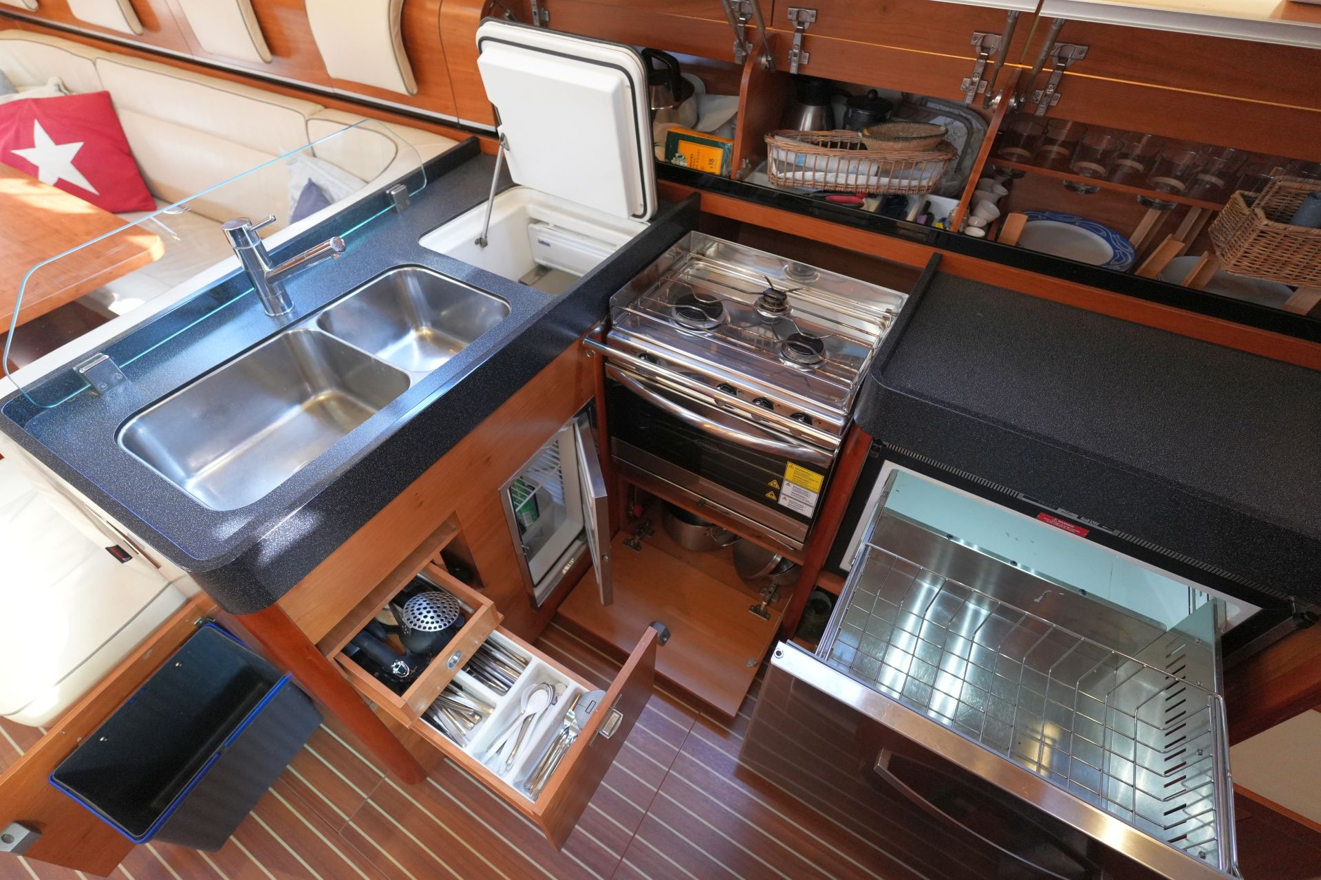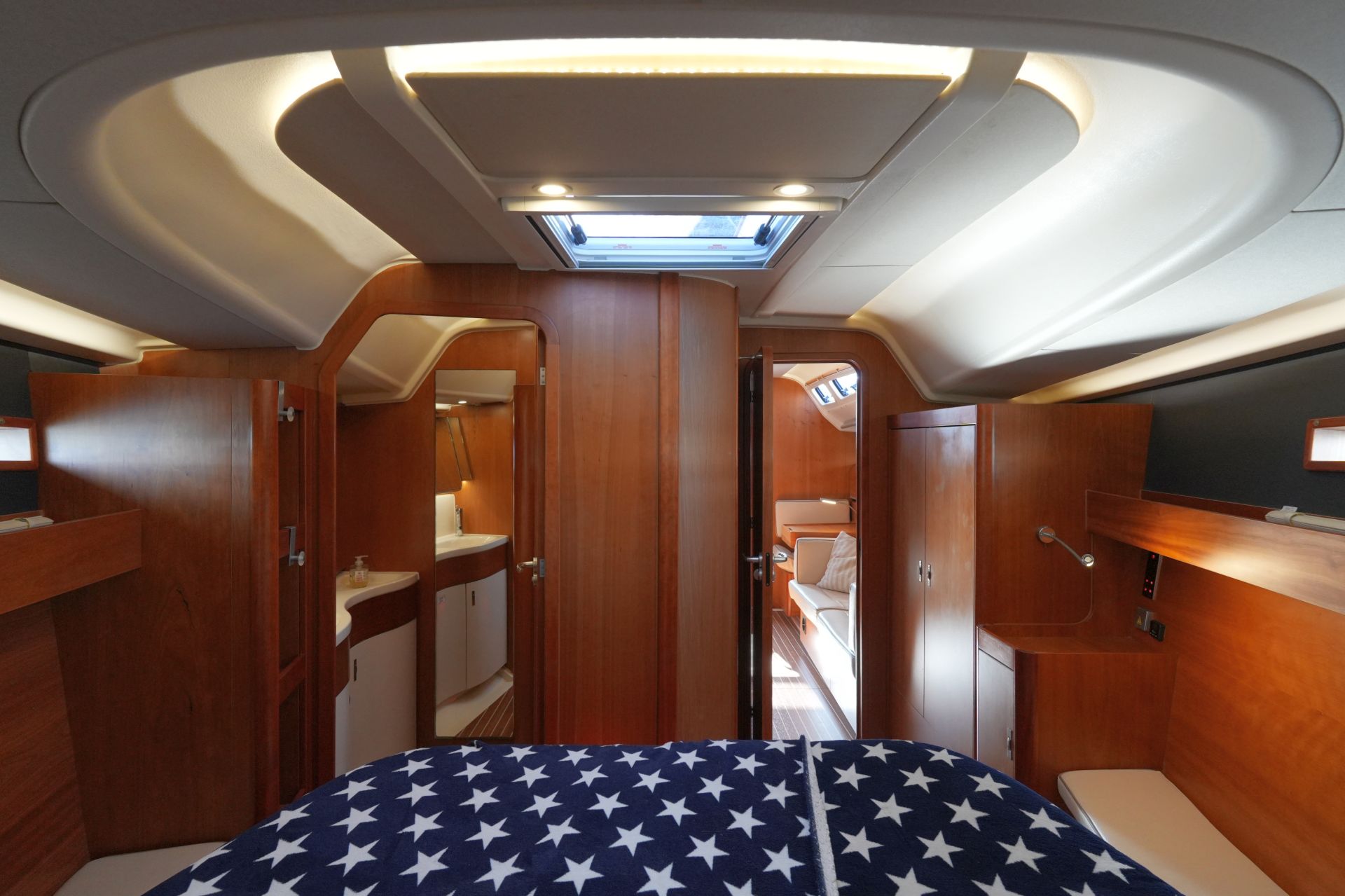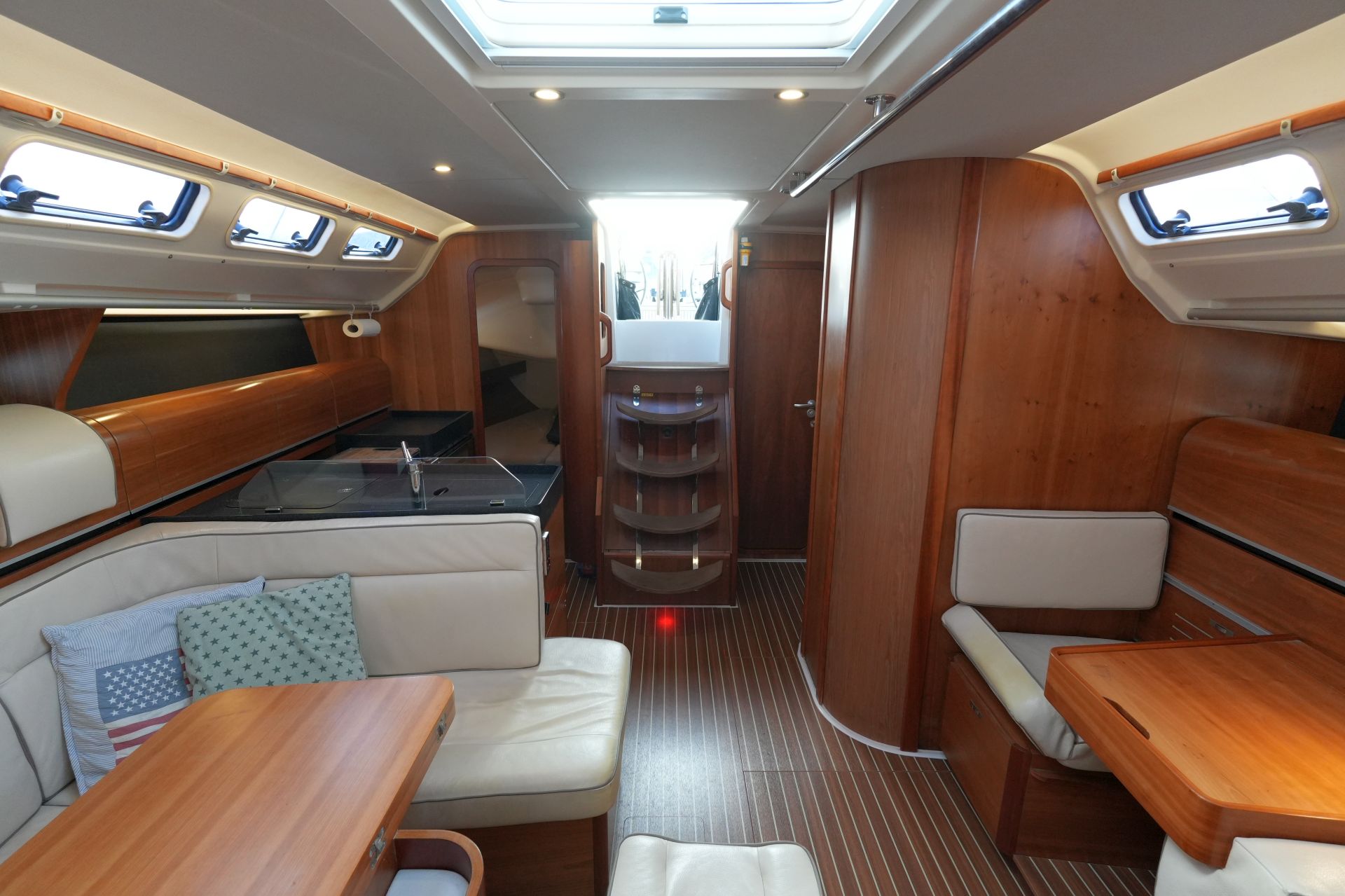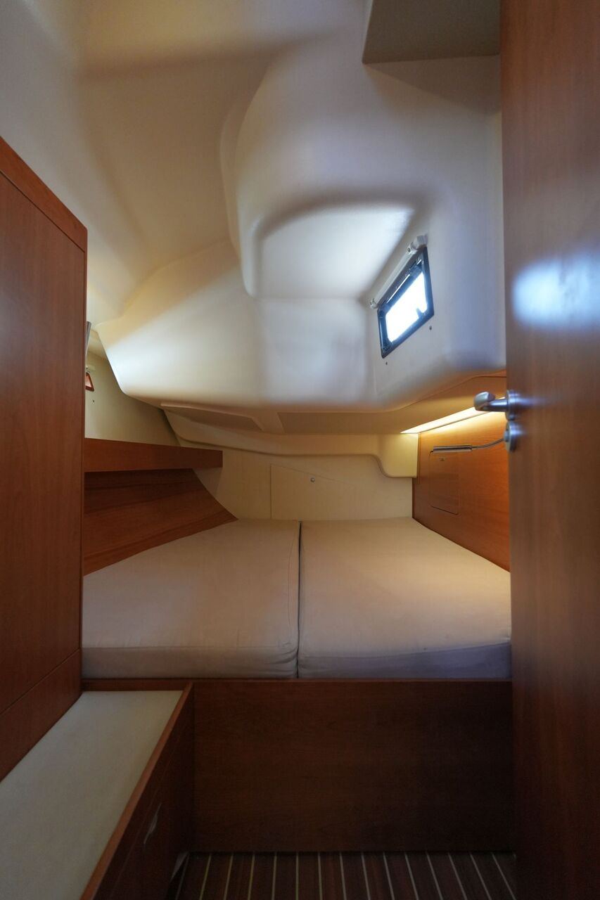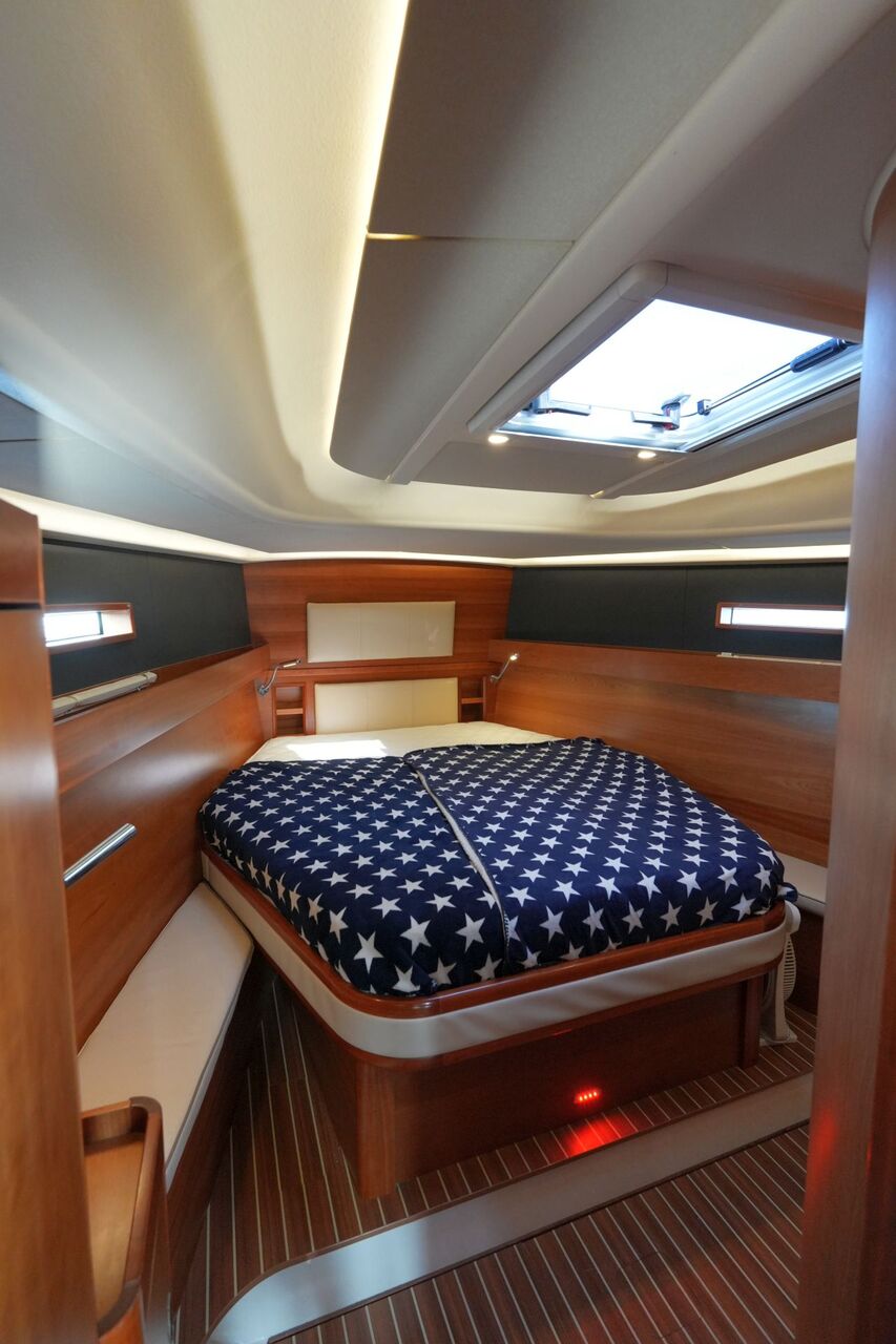 - Zwei Achterkabinen mit Doppelkoje, Schrank, Regal, Staufächern, Rumpffenster, Decksluke und Bullauge zum Cockpit