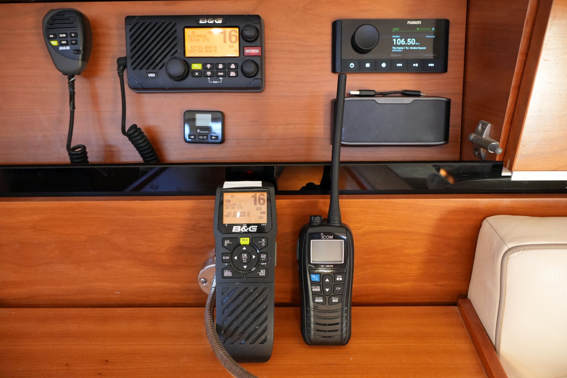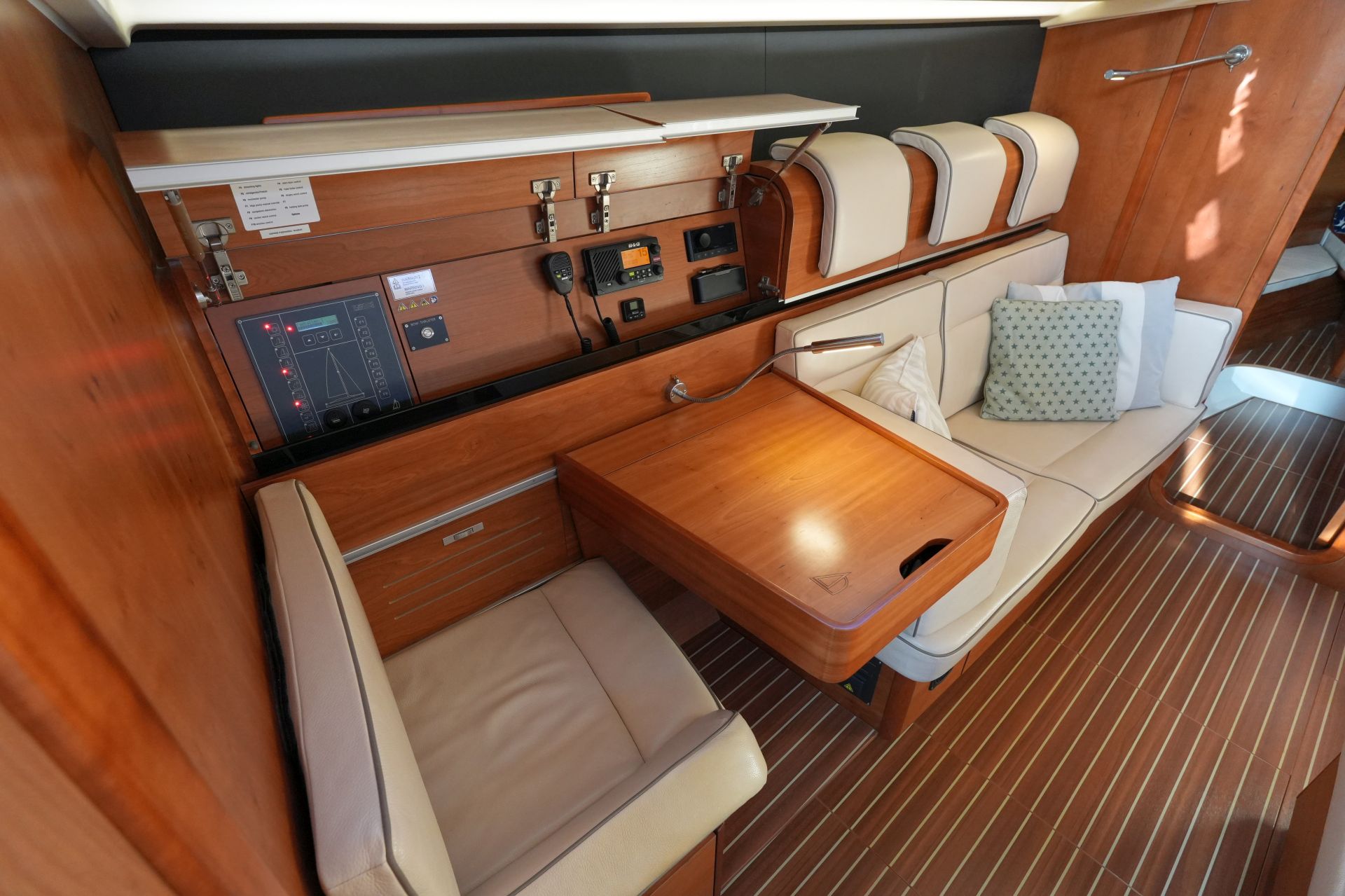 - In Fahrtrichtung eingebauter, verschiebbarer Kartentisch mit Navigatorsitz an Backbord