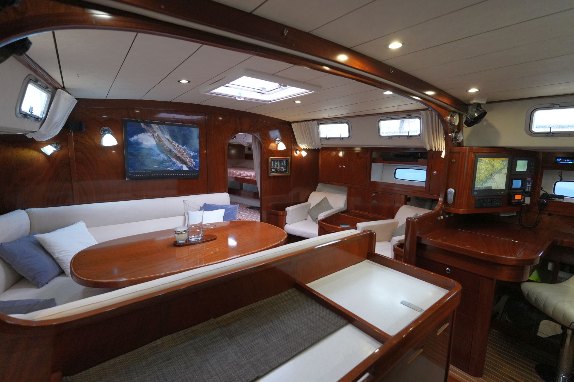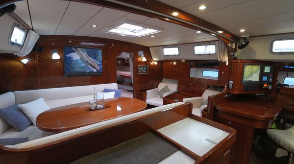 - Salon mit U-förmiger Dinette an Backbord um den Salontisch und zwei Einzelsesseln an Steuerbord