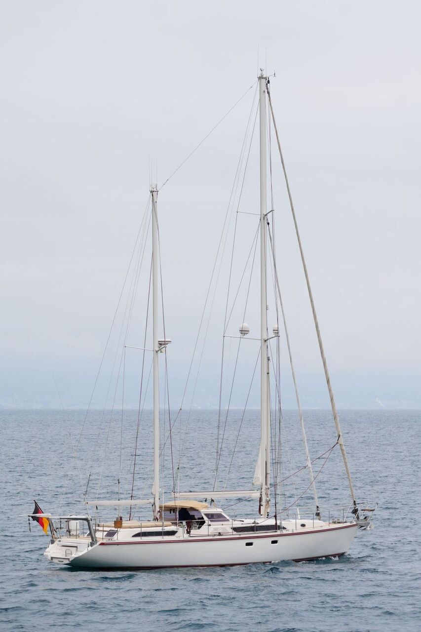 - An Deck stehender, topgetakelter, weiß lackierter AMEL Besanmast mit manueller Rollanlage und einem gepfeilten Salingspaar