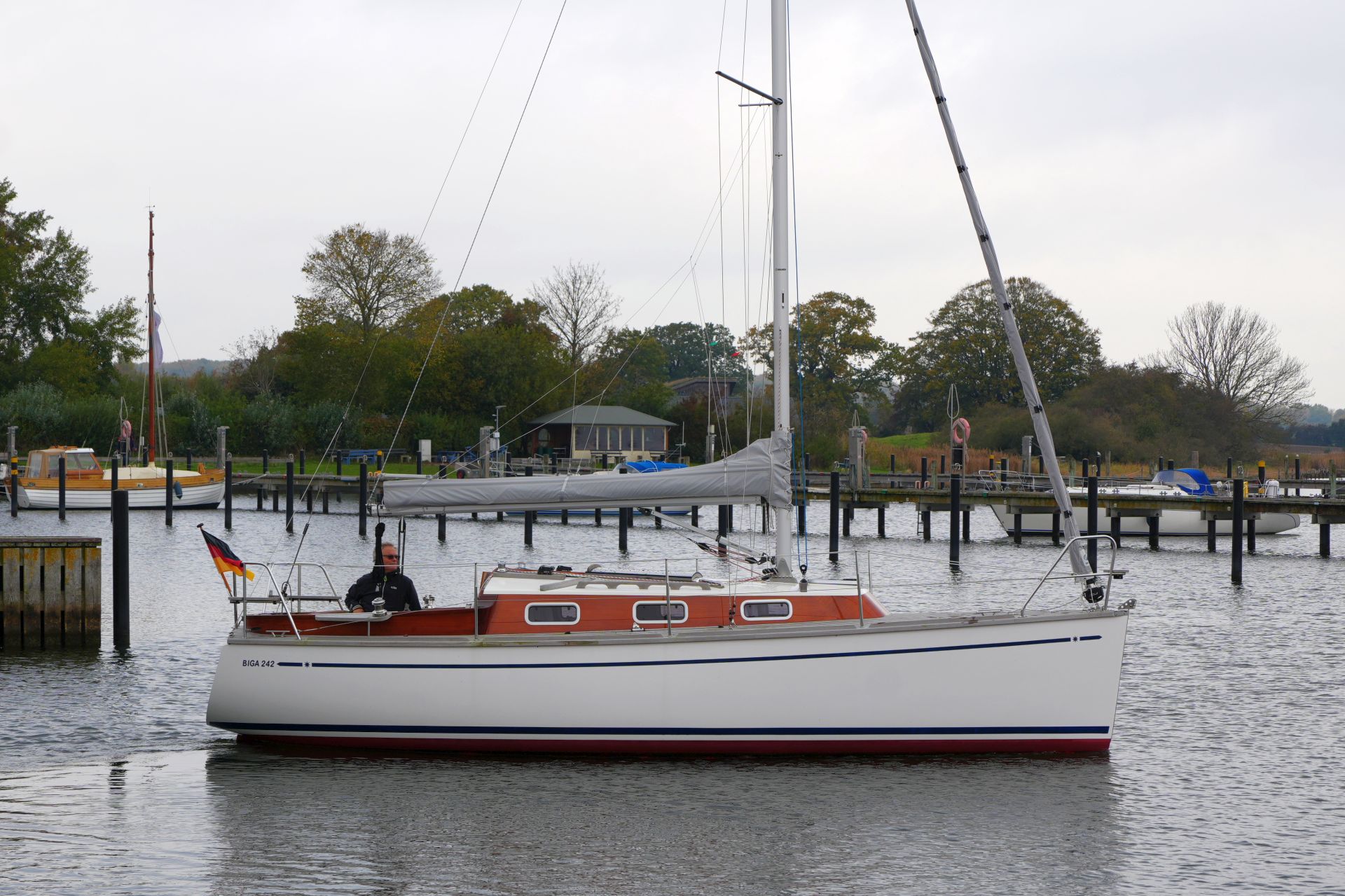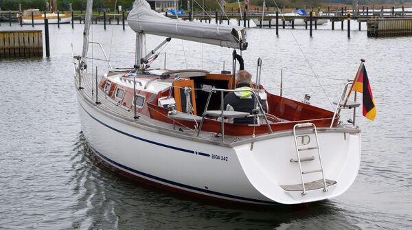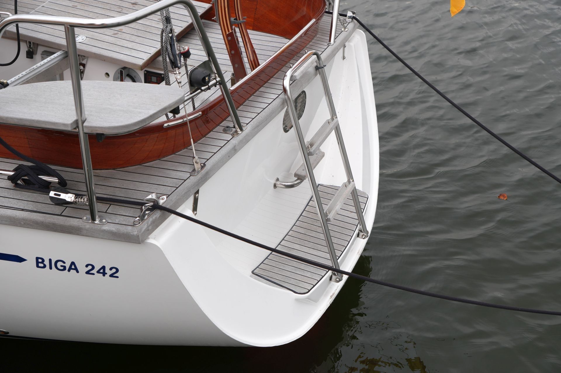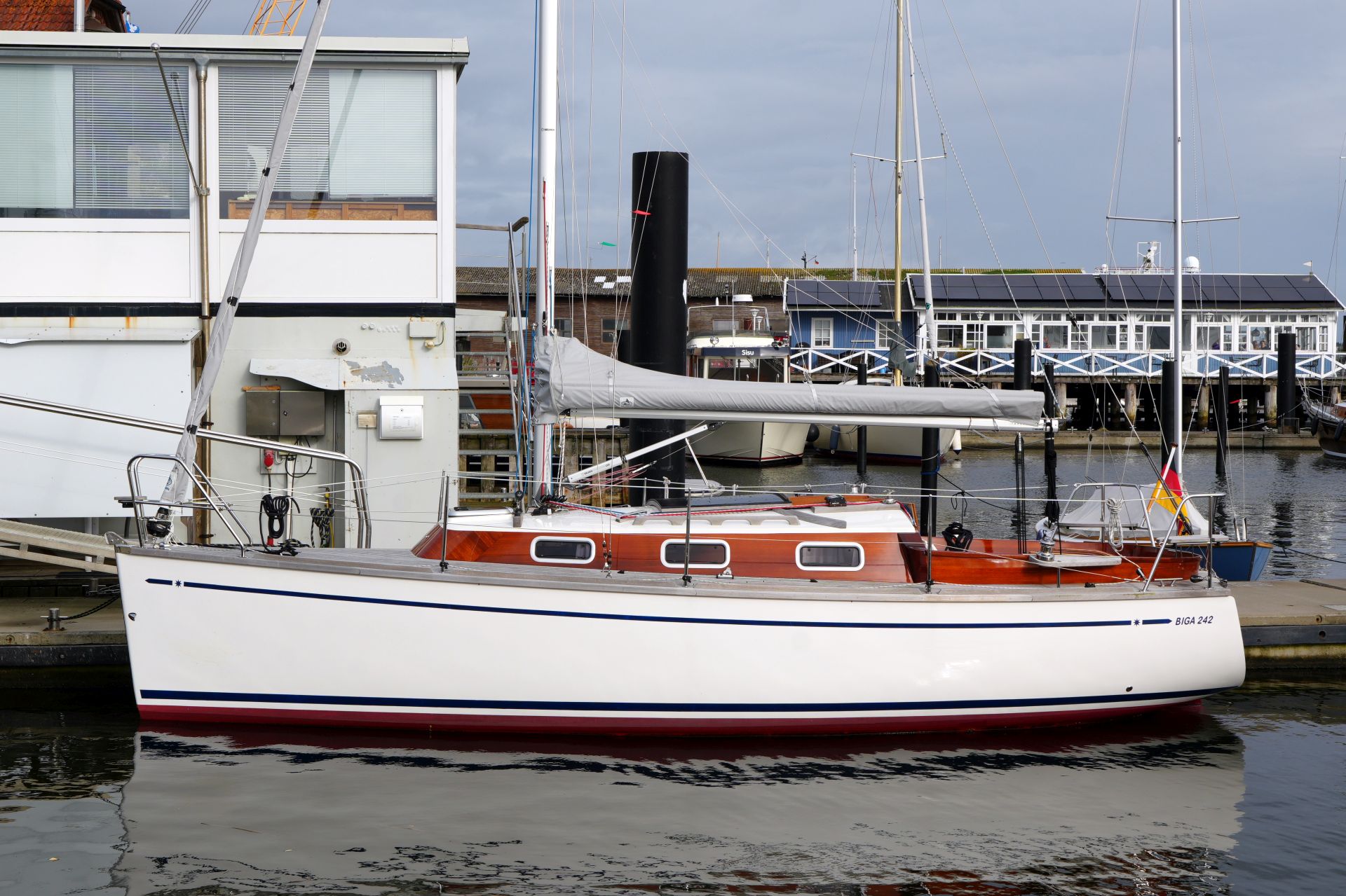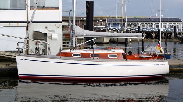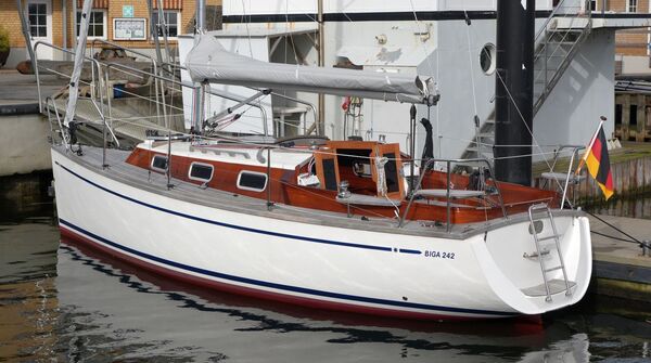 Hübscher Pocket-Cruiser in handlicher Größe von der Bootswerft Gerhard Bicker. Die Biga 242 ist das kleinste Modell der Qualitätswerft in Nordrhein-Westfalen. Moderner Riß von Juliane Hempel mit geraden Linien und kantigem Mahagoni-Aufbau. Trotz ihrer traditionellen Anmutung hat die Biga 242 aber gute Segeleigenschaften und ein angenehmes Seeverhalten dank modernem Unterwasserschiff und leistungsfähigem Rigg. Geräumiges Cockpit mit hohem Süllrand und reichlich Deckstauraum in den großen Backskisten. Wunderschönes und liebevoll ausgeführtes Interieur. Obwohl die Biga 242 in Mahagoni ausgebaut ist, wirken Salon und Kabine durch die weiß lackierten Eschen-Wegerungen, die Salondecke in Birke sowie hellblaue Polster nicht dunkel. Unter Deck bietet die Yacht durch ihr cleveres Layout erstaunlich viel Platz, Komfort und Stauraum für ein Boot dieser Größenklasse. Das deutsche Wassersport-Magazin YACHT urteilte seinerzeit: "Eine wie Keine ... keine Frage, das jüngste und aktuell zugleich kleinste Modell der westfälischen Bicker-Werft sucht seinesgleichen. Der Markt gibt kaum Vergleichbares her - zumindest nicht serienmäßig.“