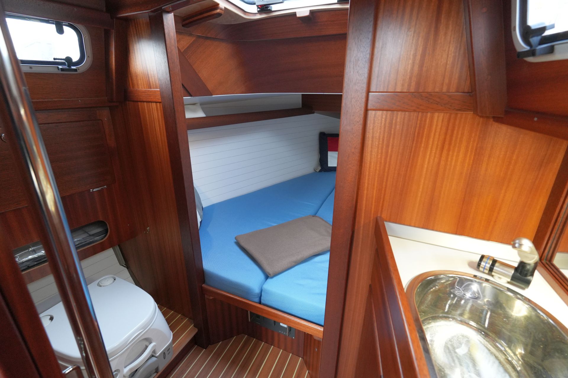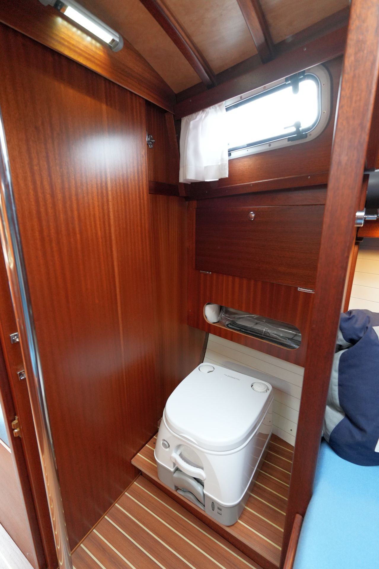 • Nasszelle auf beiden Seiten im Durchgang zur Vorschiffskabine mit Waschtisch, Waschbecken und Chemieklo