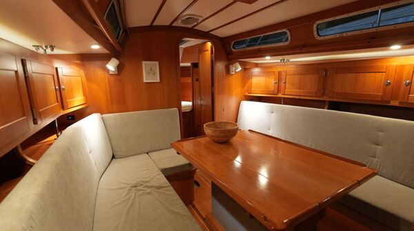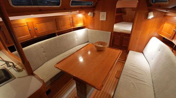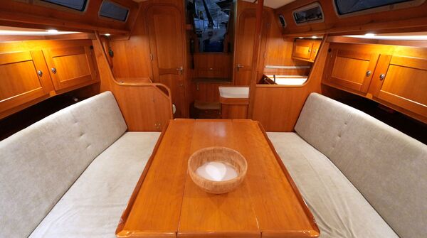 - Salon mit L-förmigem Sofa an Backbord und Längssofa an Steuerbord am klappbaren Salontisch