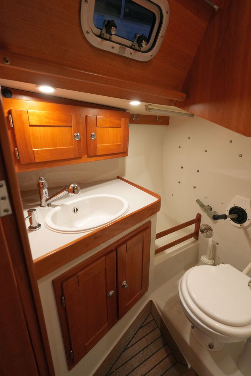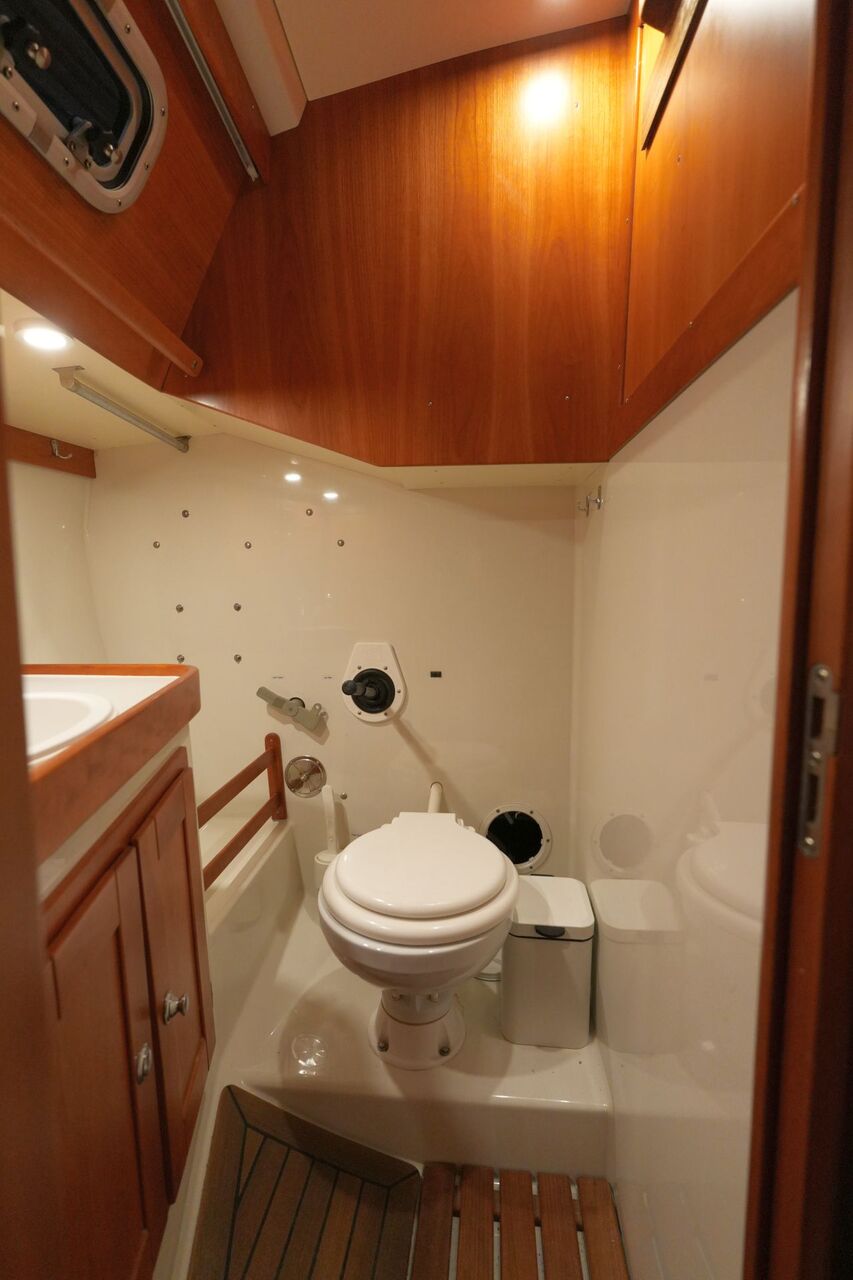 - Nasszelle an Steuerbord achtern mit Waschtisch und manueller Vakuum-Toilette