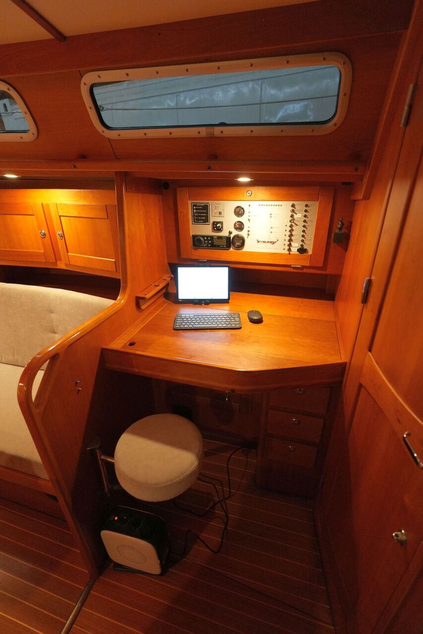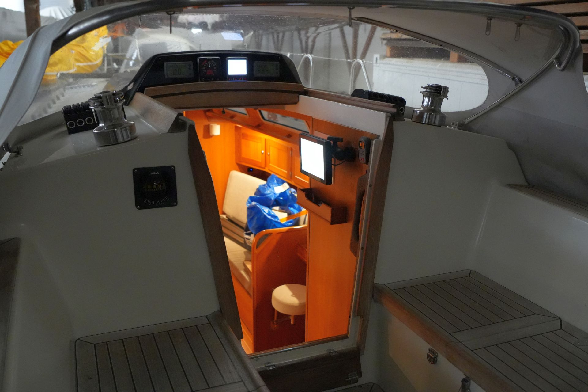 - Stauraum in Schränken, Fächern und Schubladen - Kartentisch mit schwenkbarem Navigatorsitz, Schaltpanel und Instrumenten an Steuerbord achtern