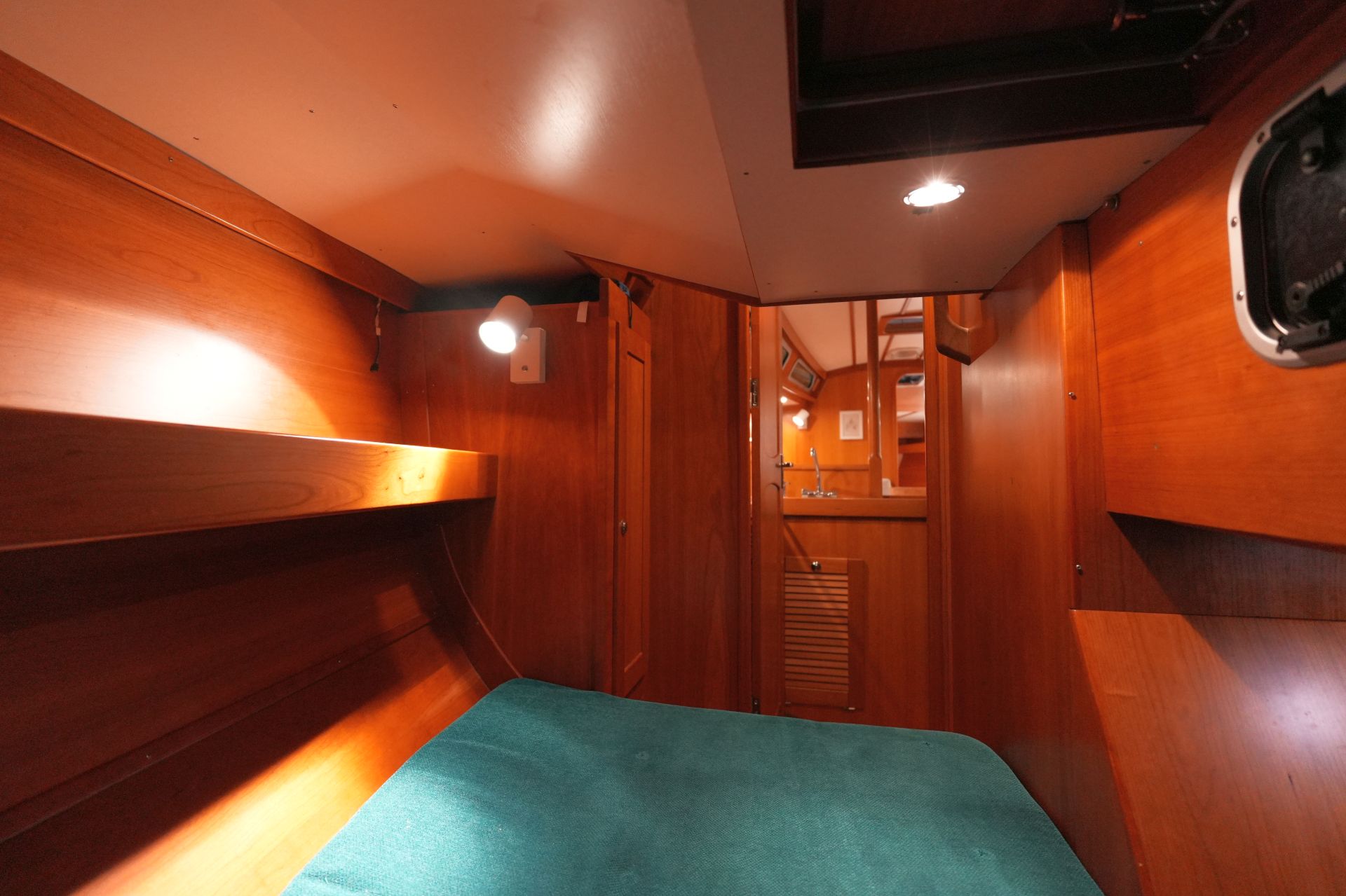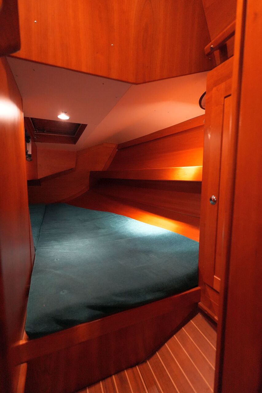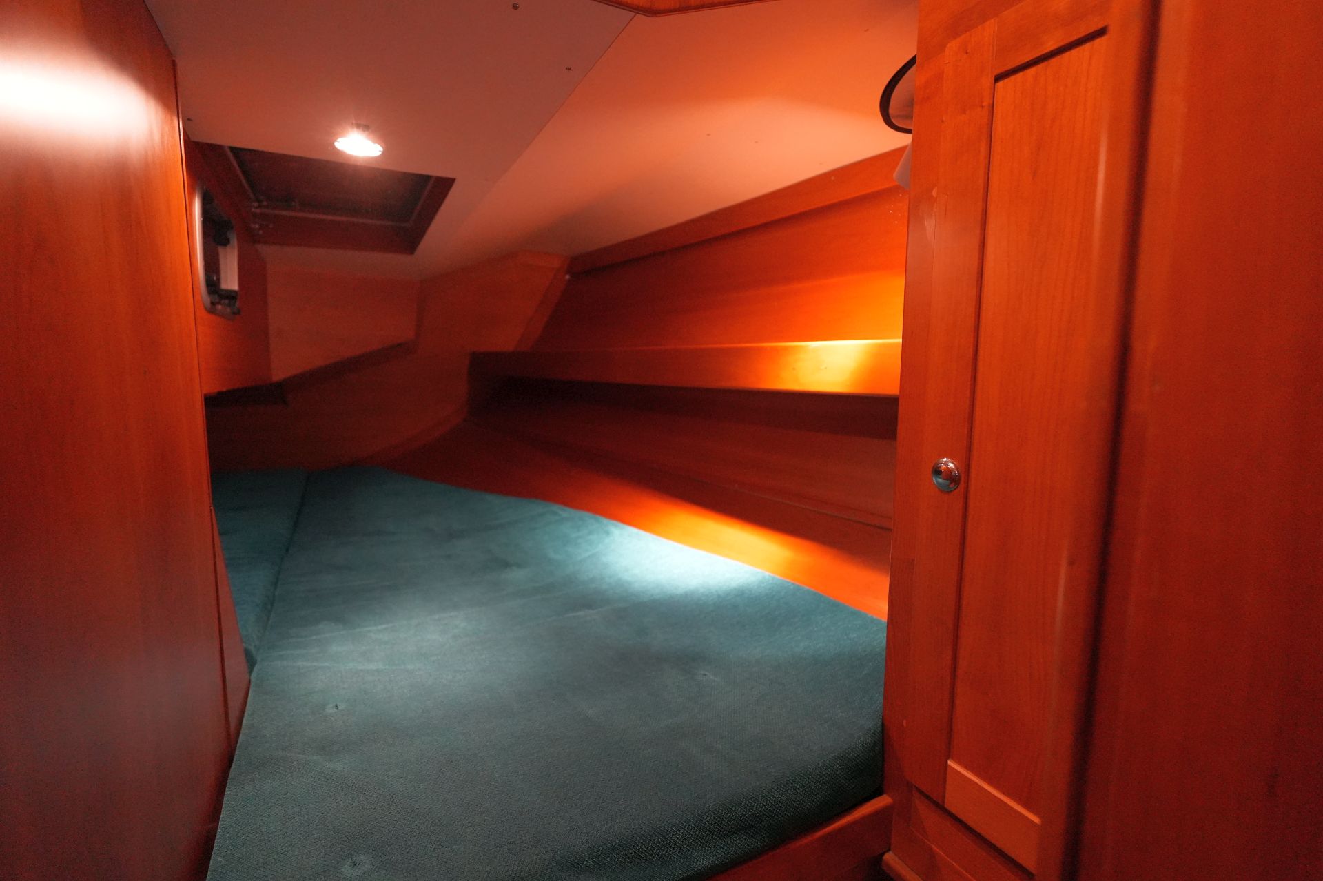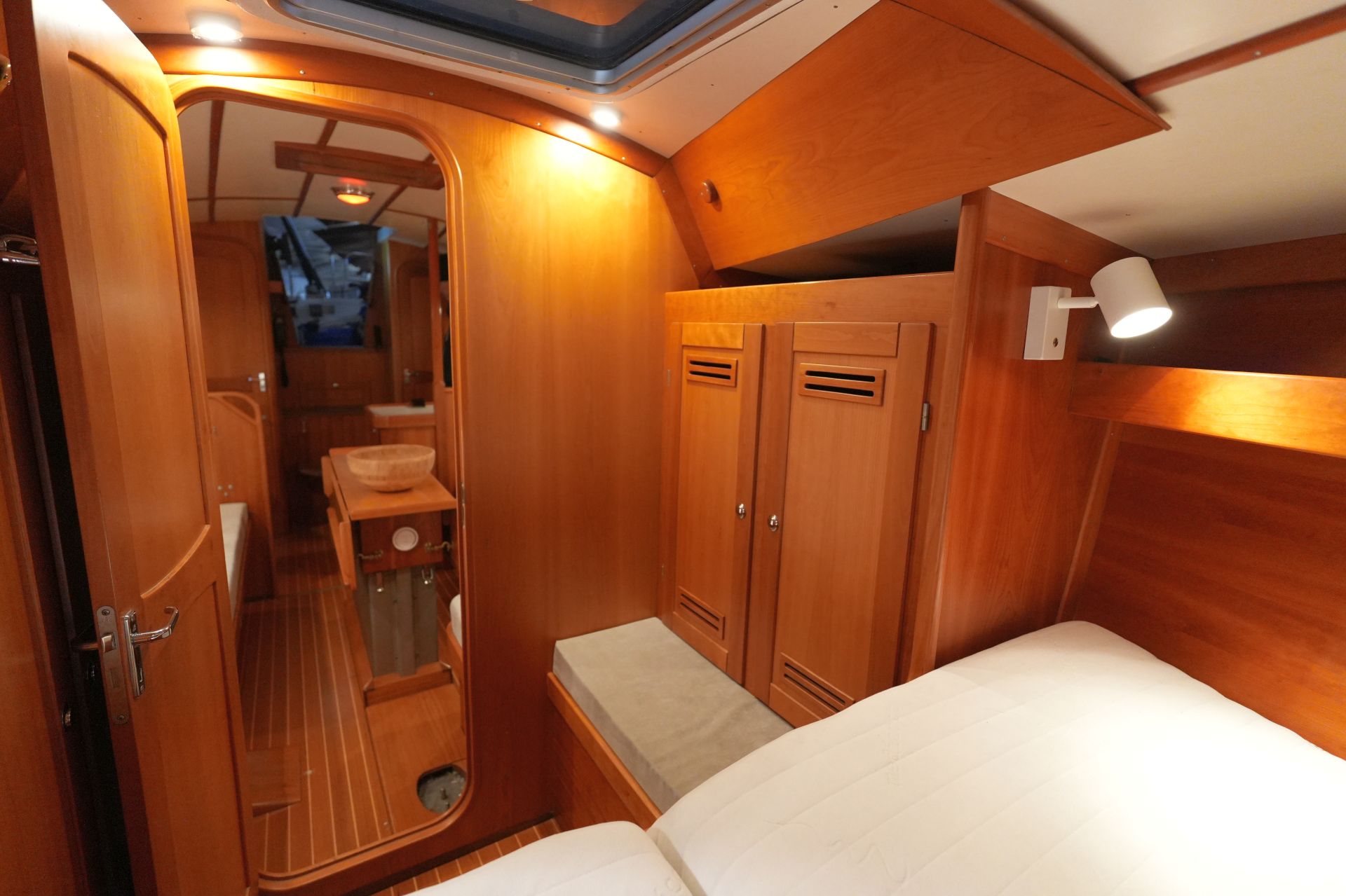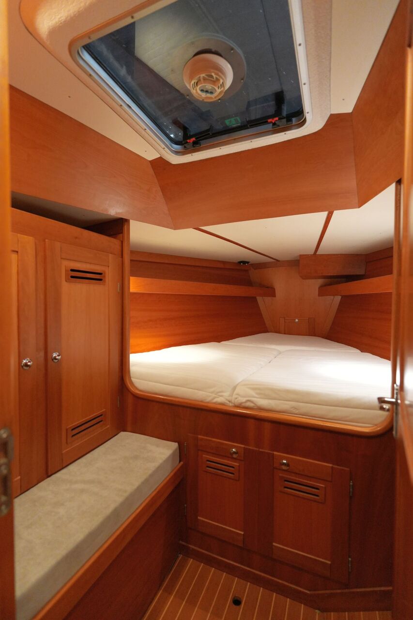 - Achterkabine an Backbord mit Doppelkoje, Schrank, Regal und Bullauge (die Kabine hat einen großen Backkistendeckel und kann als weiterer, großer Deckstauraum genutzt werden)