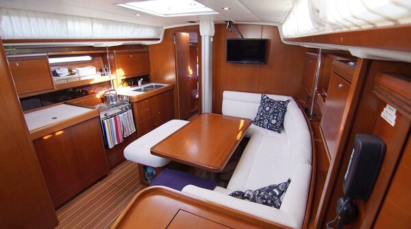 - Salon mit U-förmiger Dinette an Steuerbord und zentraler Sitzbank am Salontisch