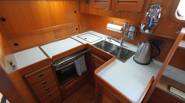- Gasherd (2 Flammen und Backofen) - Achterkabine mit zwei Einzelkojen und Sitz dazwischen, reichlich Stauraum in Schränken und Staufächern, Decksluke und drei Aufbaufenster