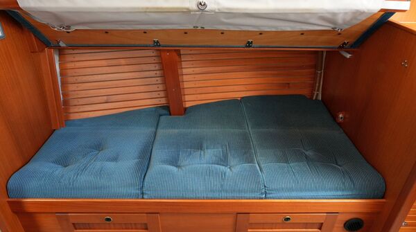 - Längssofa an Steuerbord (kann durch Hochklappen der Rückenlehne zu einer zusätzlichen Koje umgebaut werden)