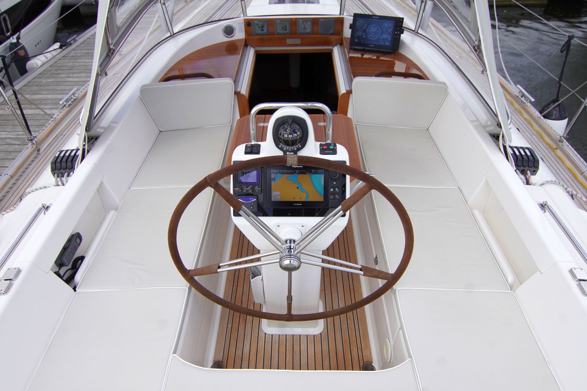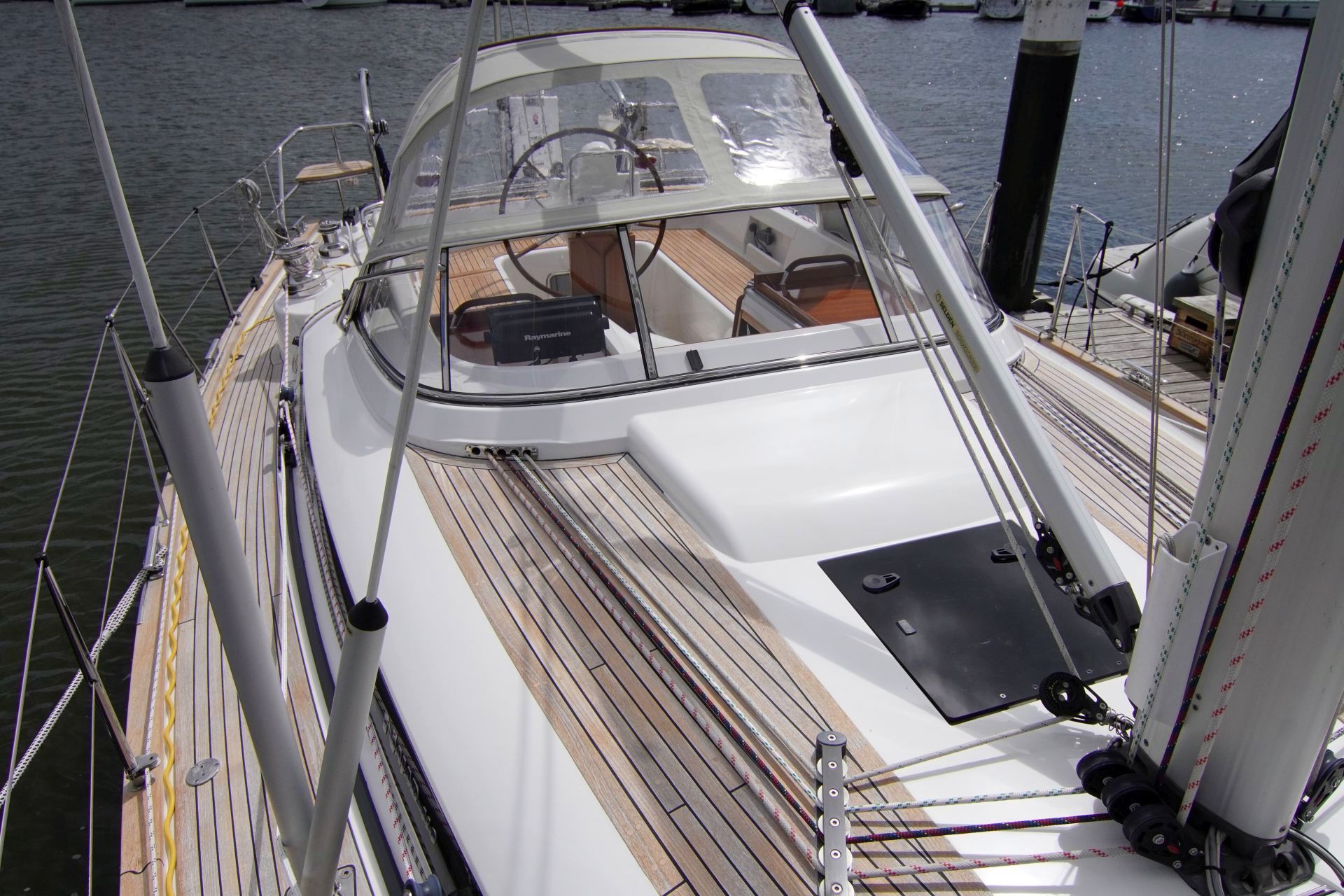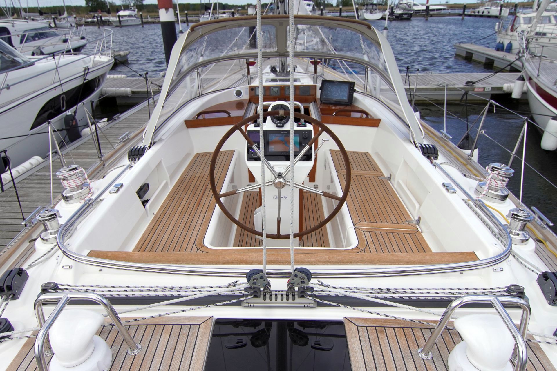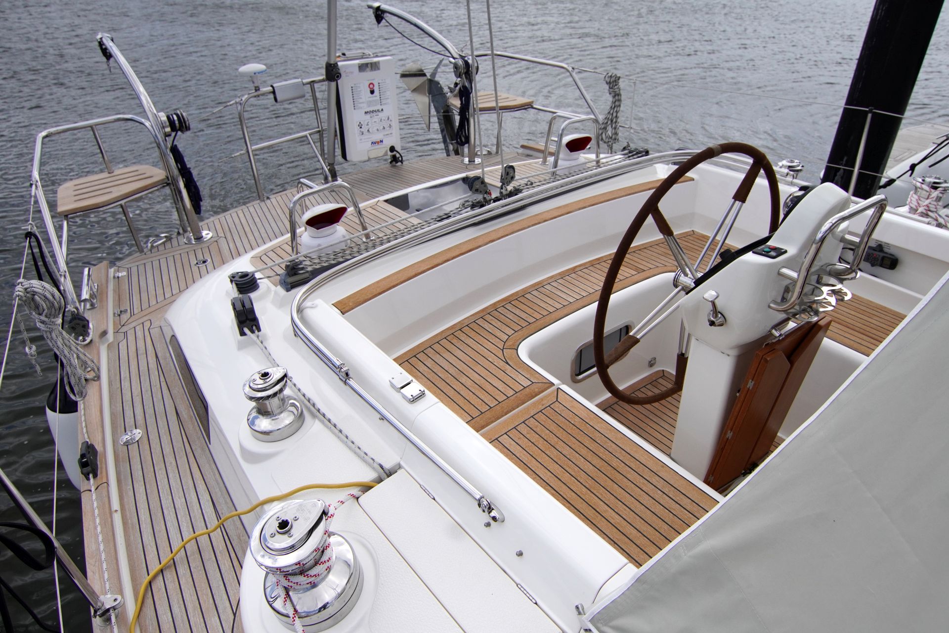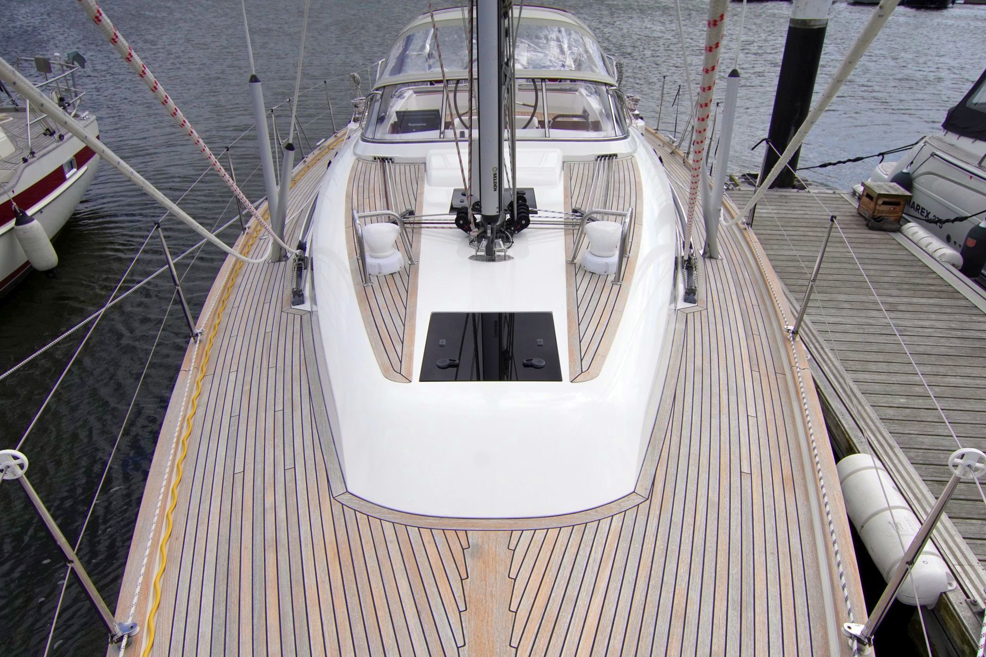 - Teakstabdeck auf Seitendecks, Aufbaudach, Badeplattform und im Cockpit