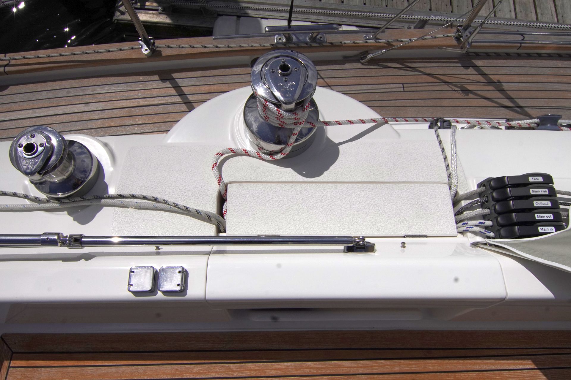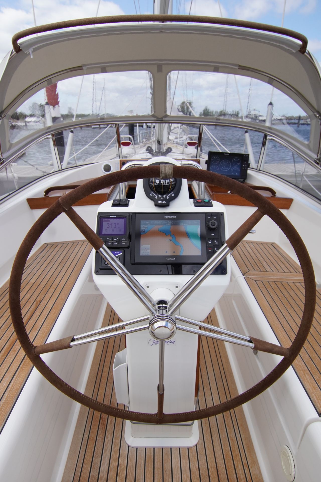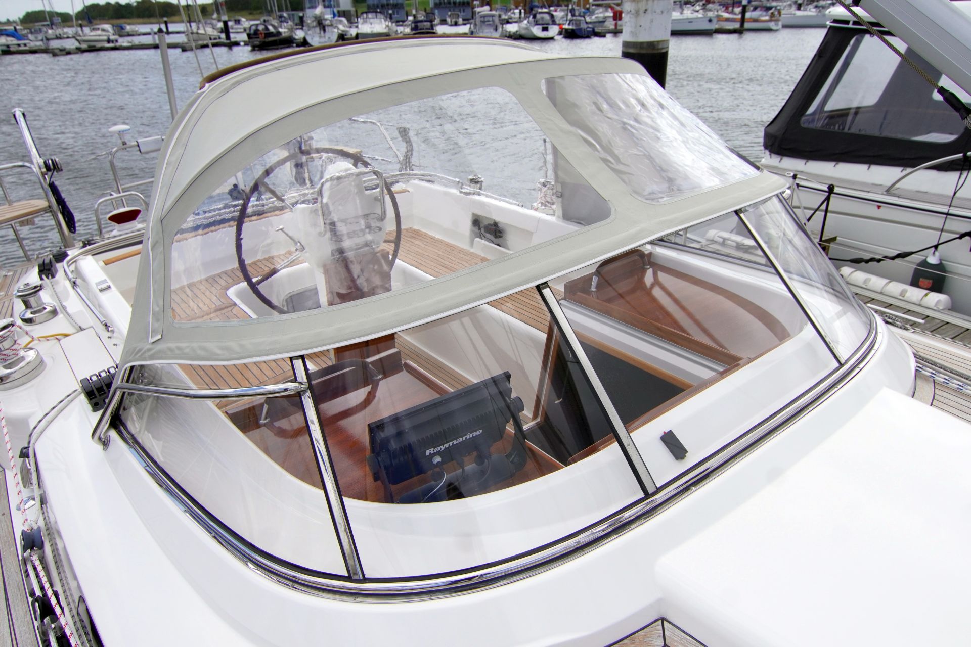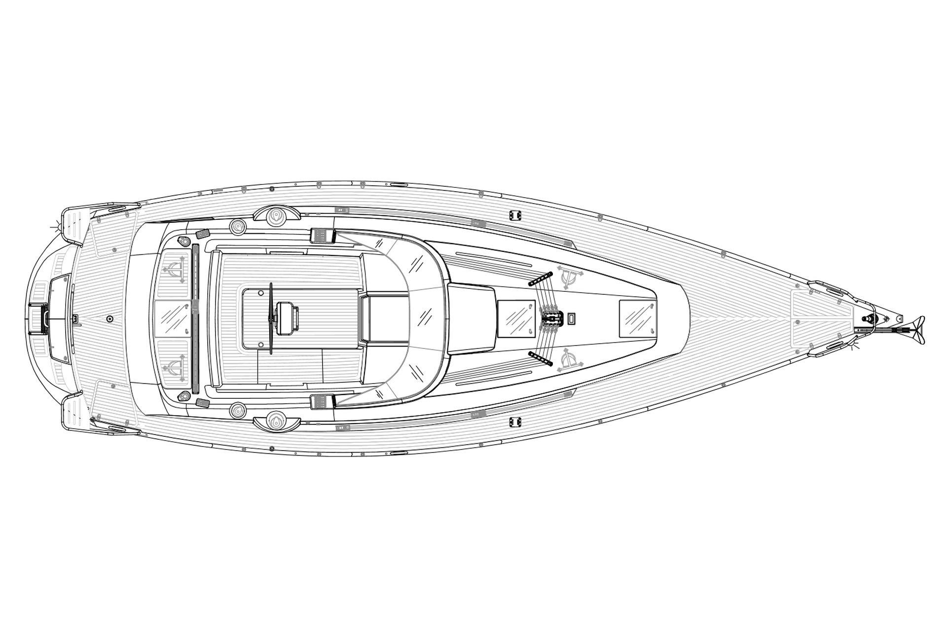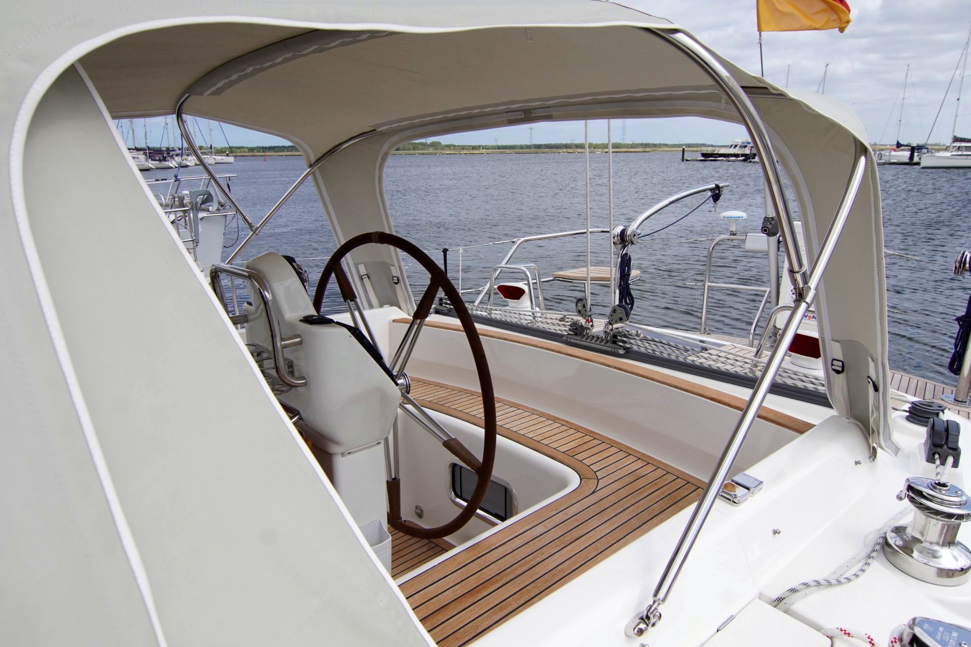 - Teakstabdeck auf Seitendecks, Aufbaudach, Badeplattform und im Cockpit