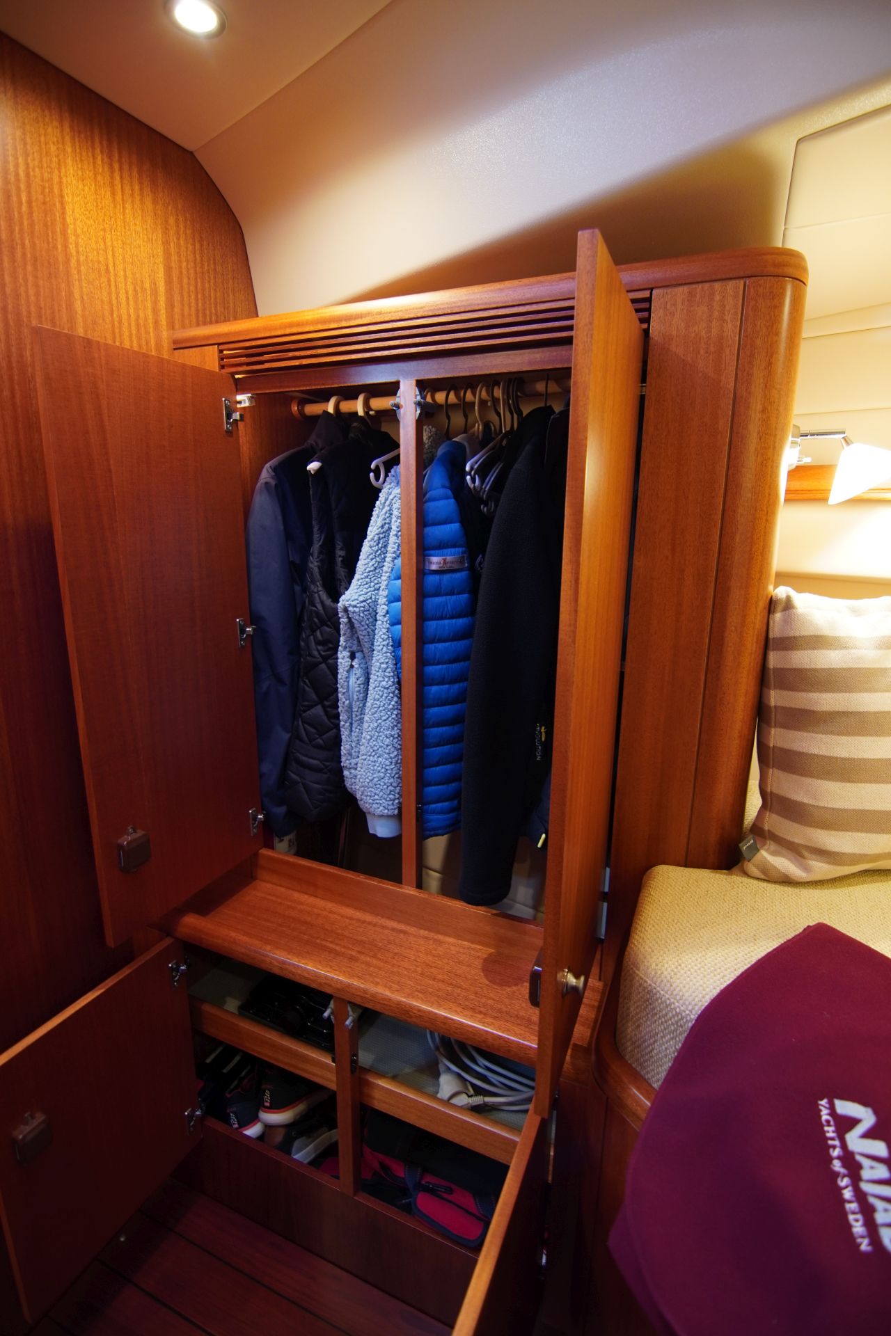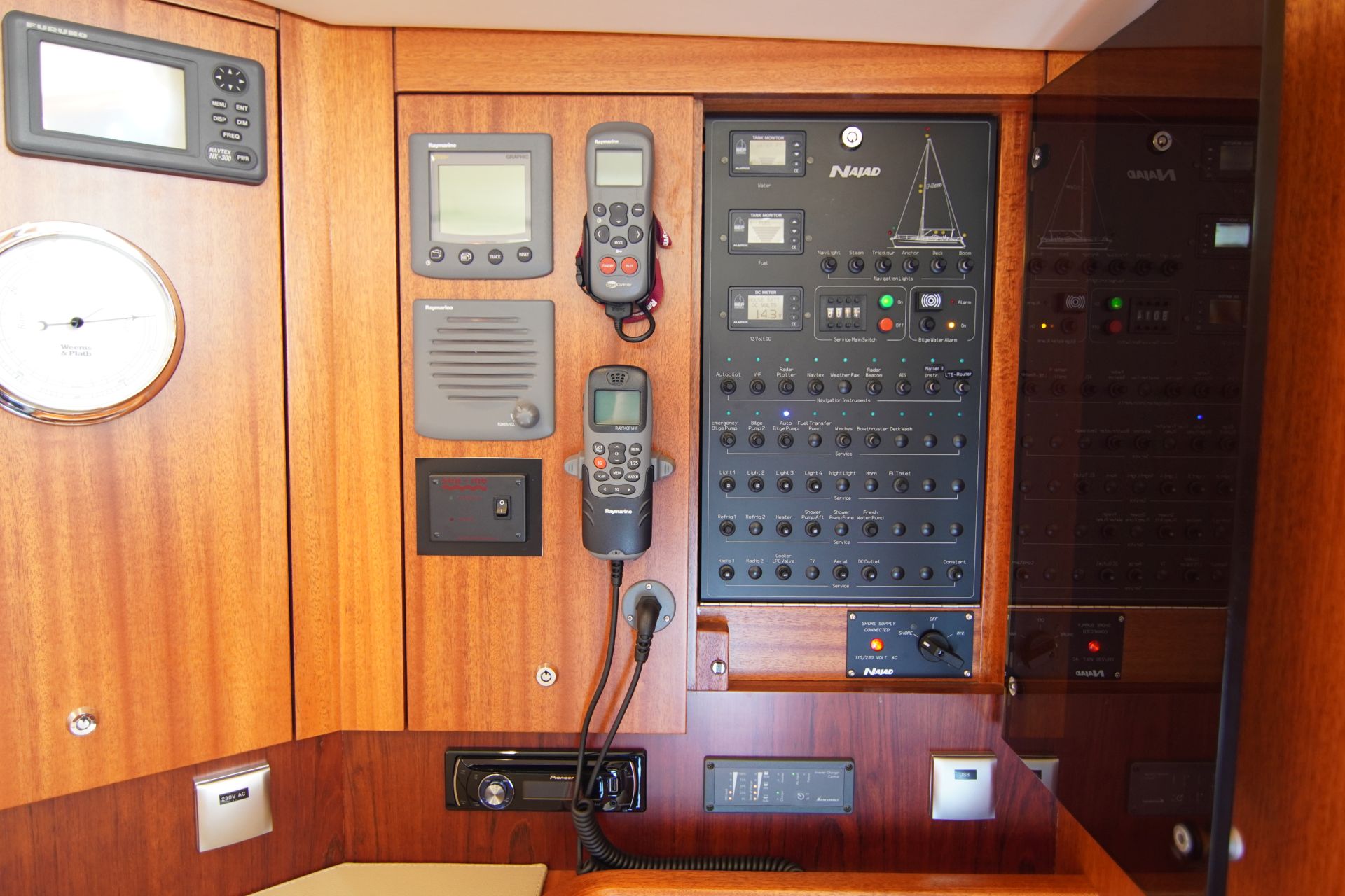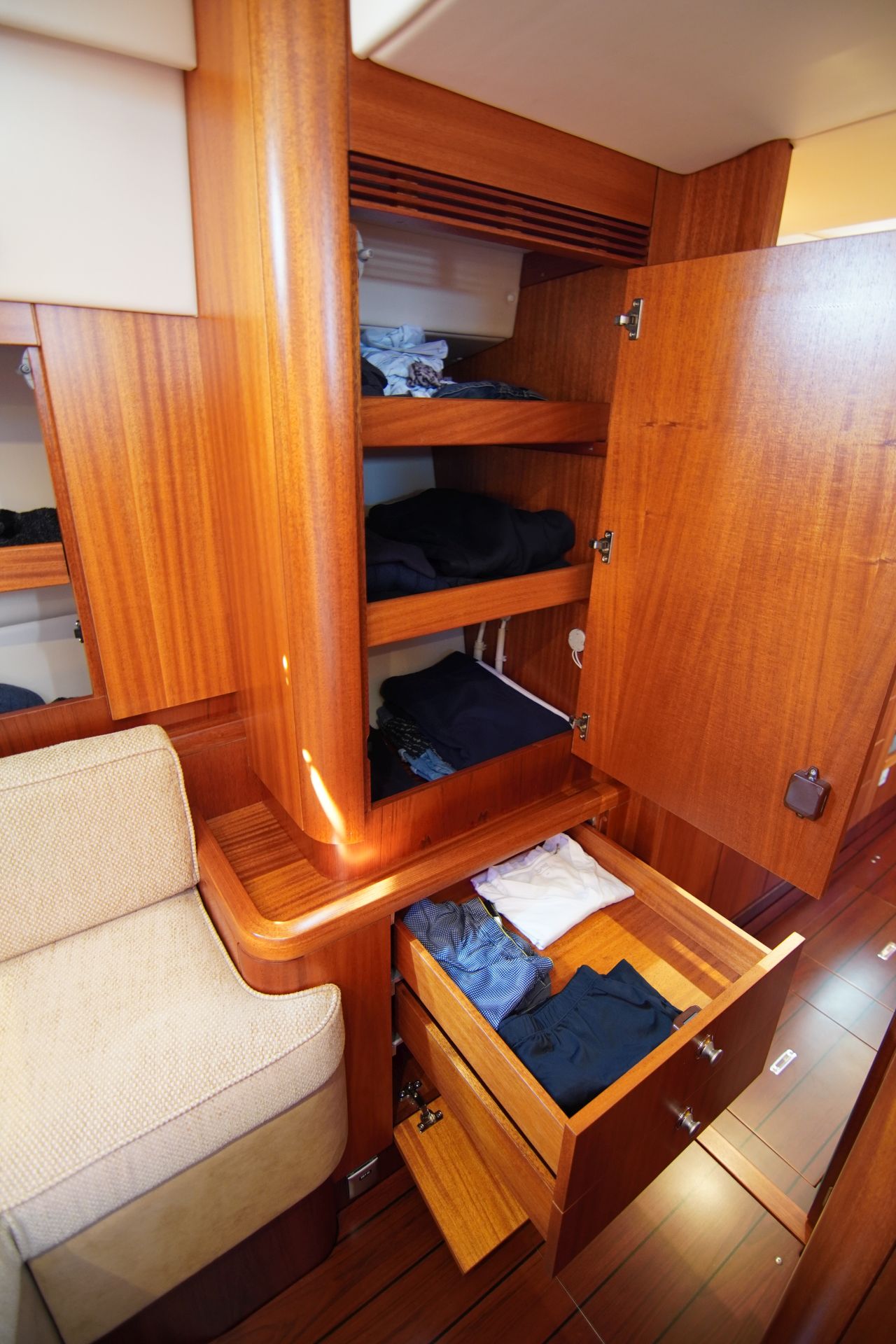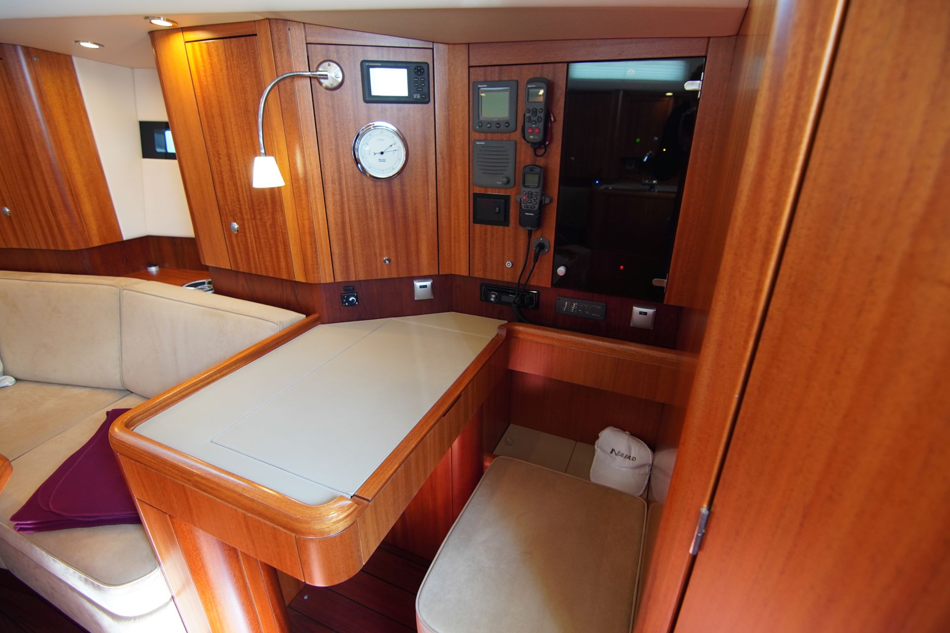 - Viel Stauraum in Schränken, Fächern und Schubladen - Kartentisch mit Navigatorsitz in Fahrtrichtung eingebaut an Steuerbord achtern