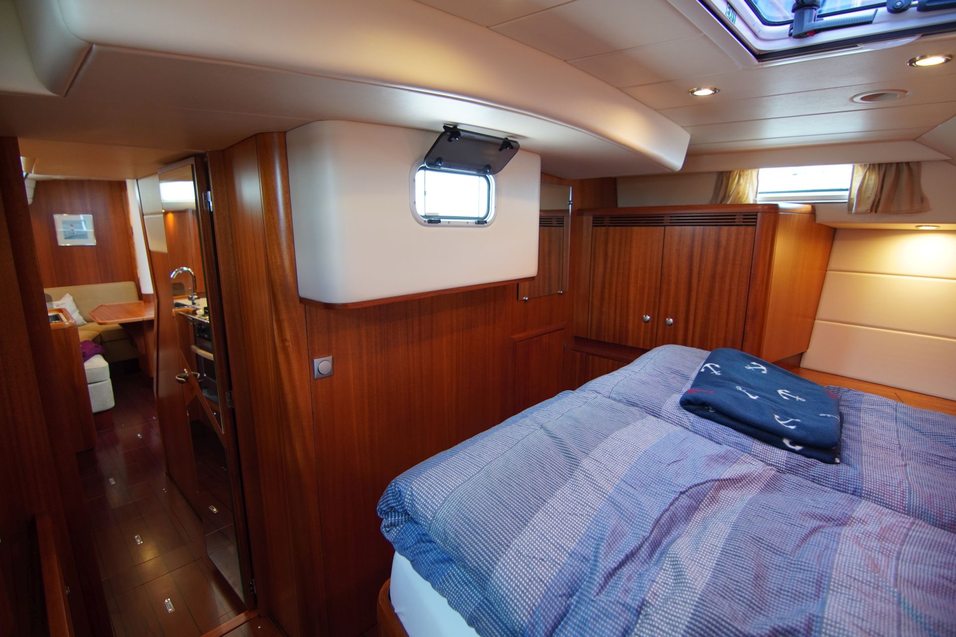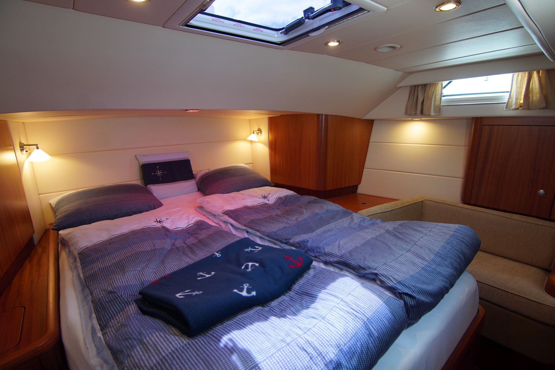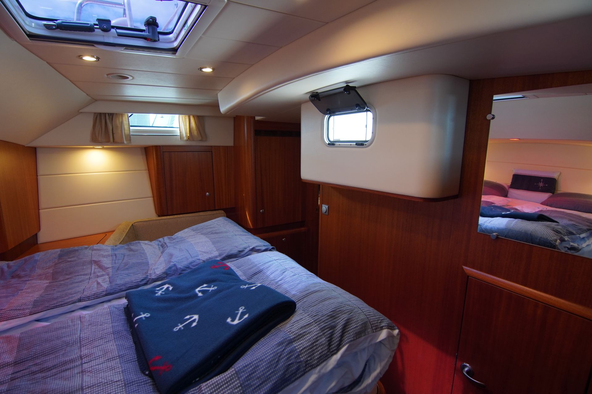 - Geräumige Eignerkabine achtern über die gesamte Schiffsbreite mit freistehender queensize Doppelkoje und Sofa, Schränken, Schubladen, Regalen, Decksluke, Bullauge zur Cockpitwanne und Aufbaufenstern