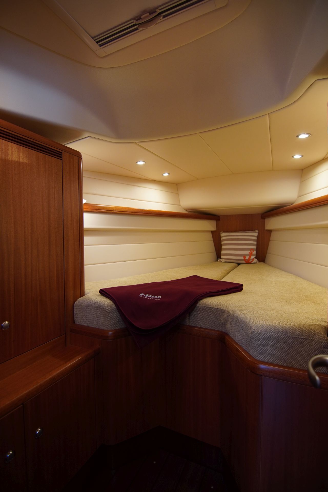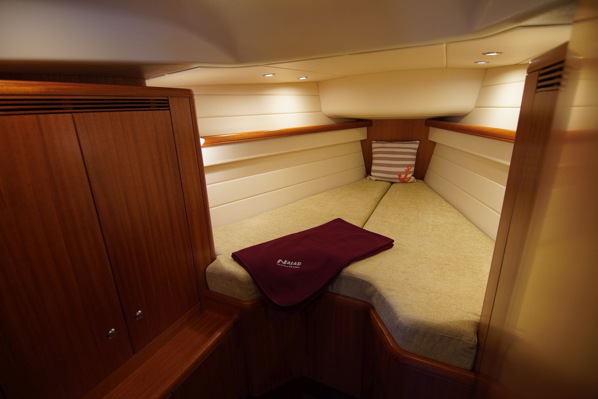 - Vorschiffskabine mit V-förmiger Doppelkoje und zwei Schränken