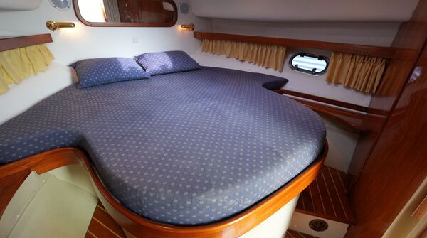 • Vorschiffskabine mit breiter Doppelkoje, sehr großem Stauraum unter Koje, Decksluke, zwei Rumpffenstern, Schrank, Regalen