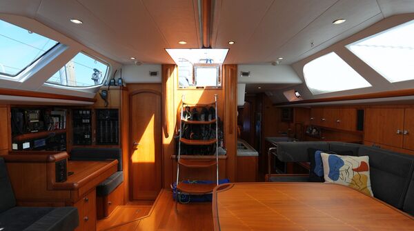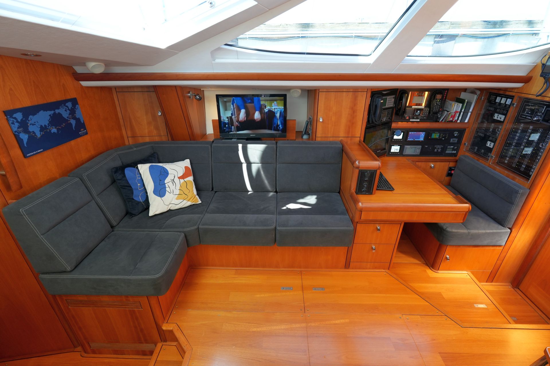 - In Fahrtrichtung eingebauter Kartentisch mit Navigatorsitz, Elektropanelen und großen Instrumentenkonsolen an Steuerbord achtern