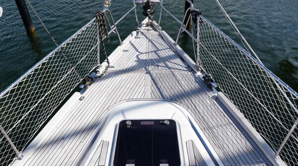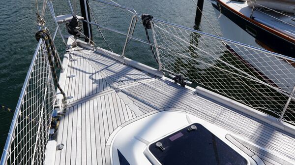 - Teakdeck auf Seitendecks, Vorschiff, Aufbaudach, Achterdeck, Badeplattform und im Cockpit