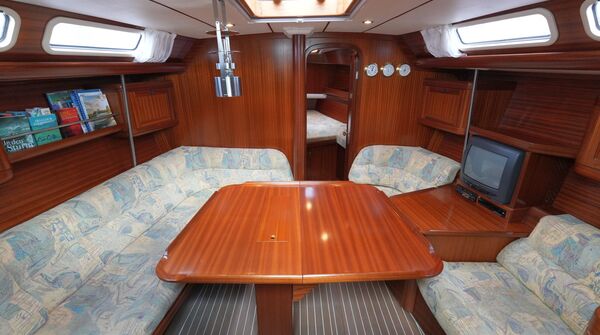 - Salon mit U-förmigem Sofa an Backbord am klappbaren Salontisch