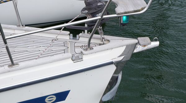 - Solide umlaufende Reling in geschweißtem Edelstahlrohr mit Relingstoren an Steuerbord und Backbord