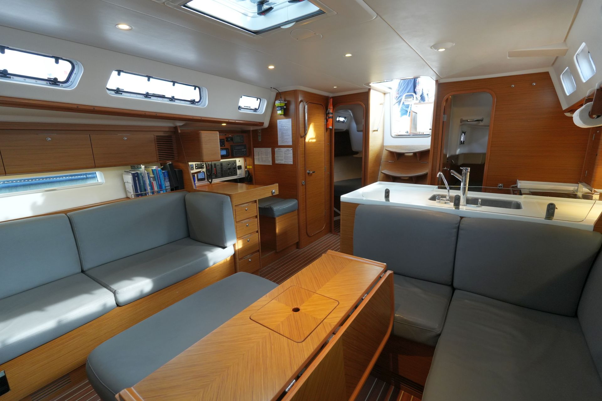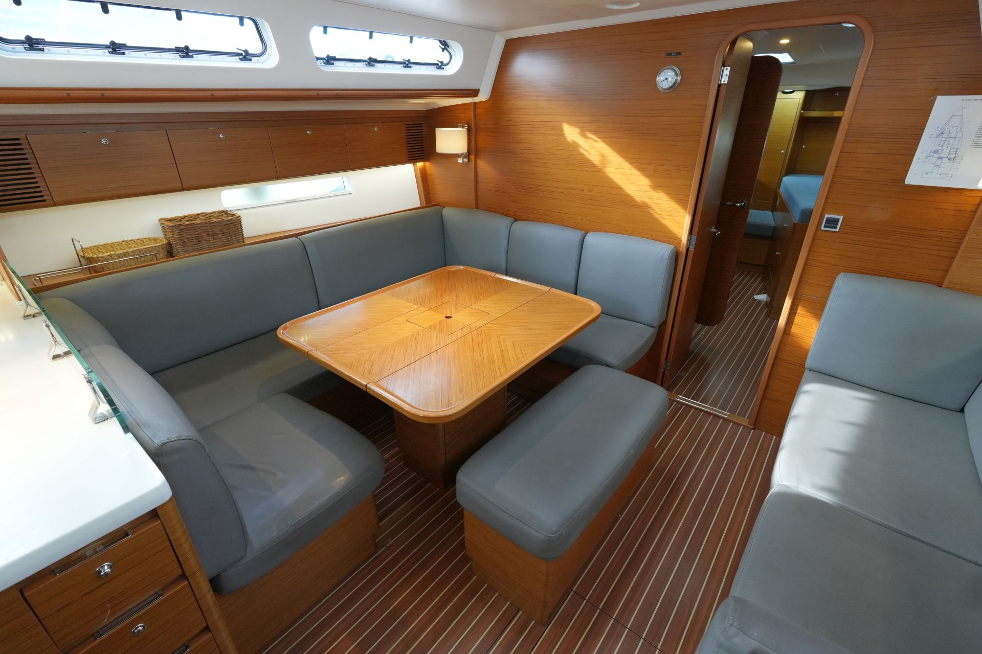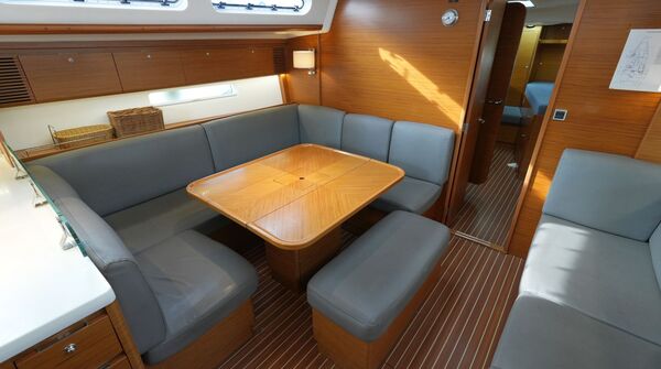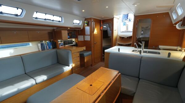 - Geräumiger Salon mit U-förmiger Sitzgruppe und zentraler Sitzbank um den beidseitig klappbaren Salontisch an Backbord