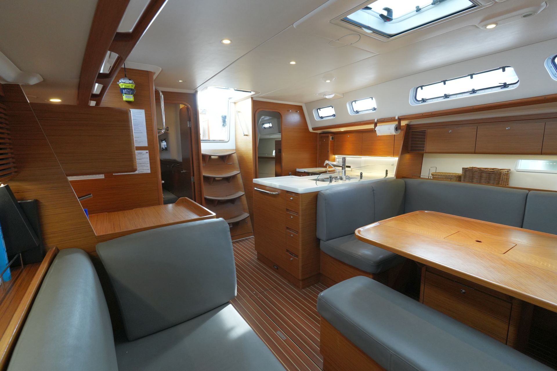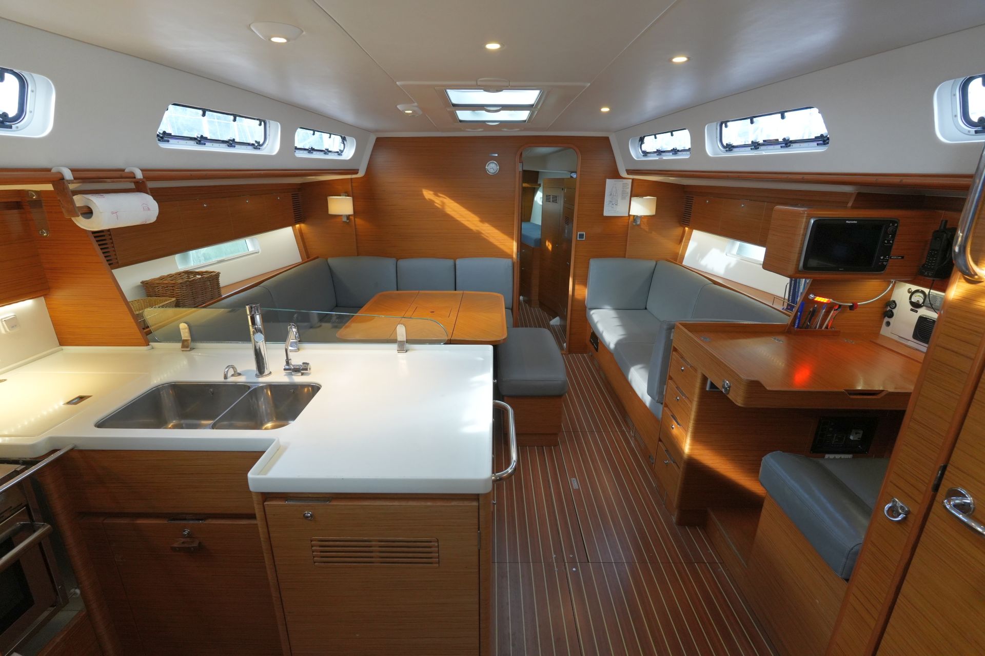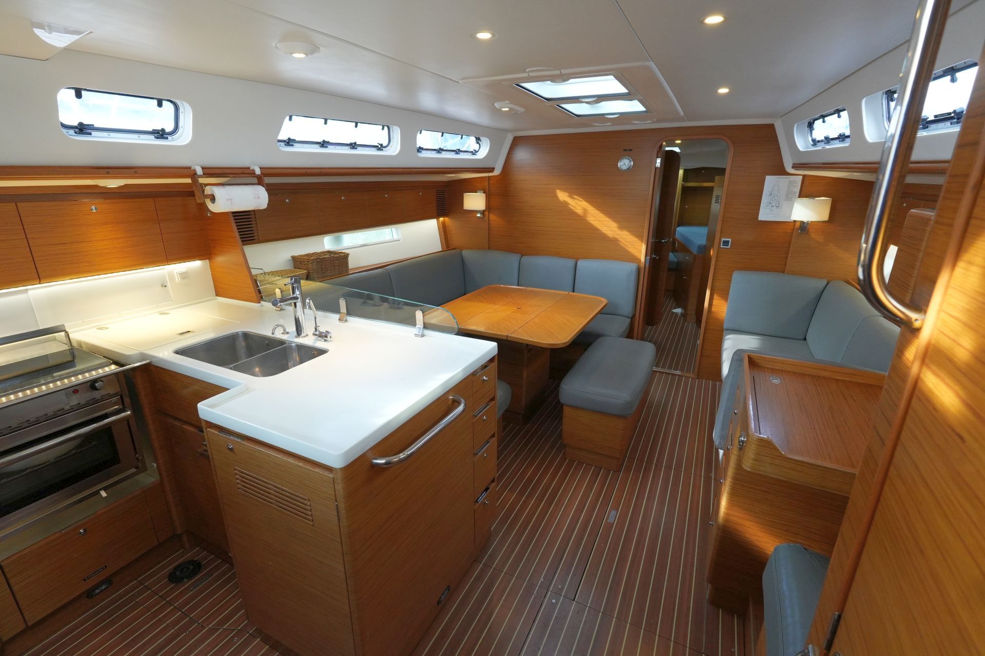- Geräumiger Salon mit U-förmiger Sitzgruppe und zentraler Sitzbank um den beidseitig klappbaren Salontisch an Backbord