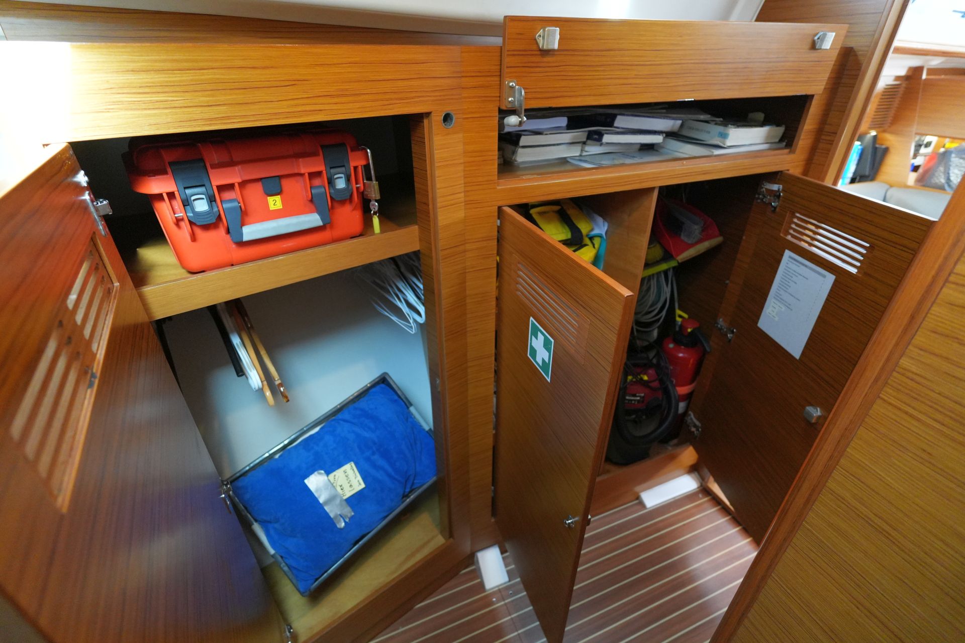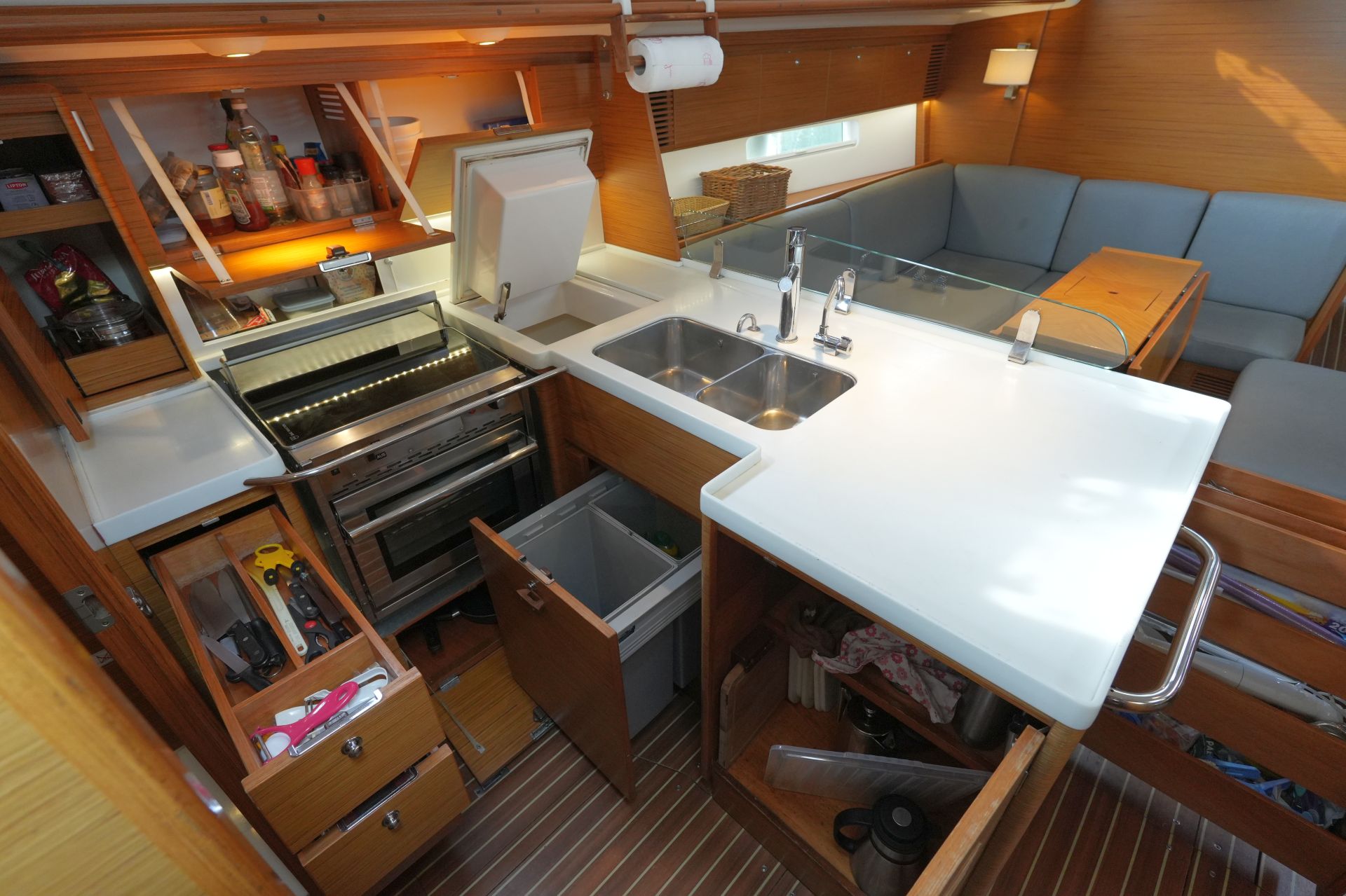 - Ausbau in Alpi-Teak mit weiß bespannten Verkleidungen an den Bordwänden, weiß bespannten Deckenpanelen und laminierten Bodenbrettern in Teak-Optik mit hellen Streifen