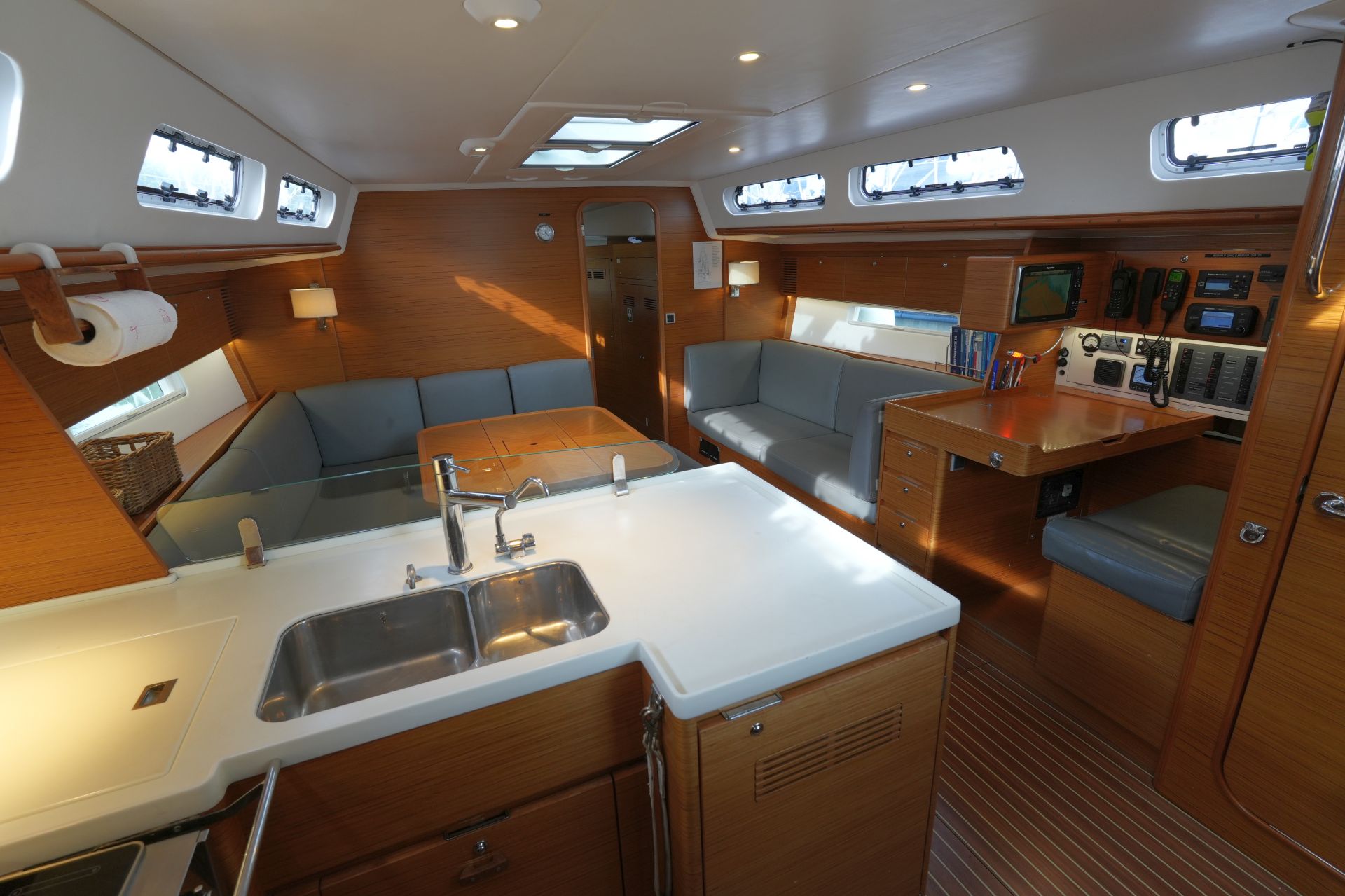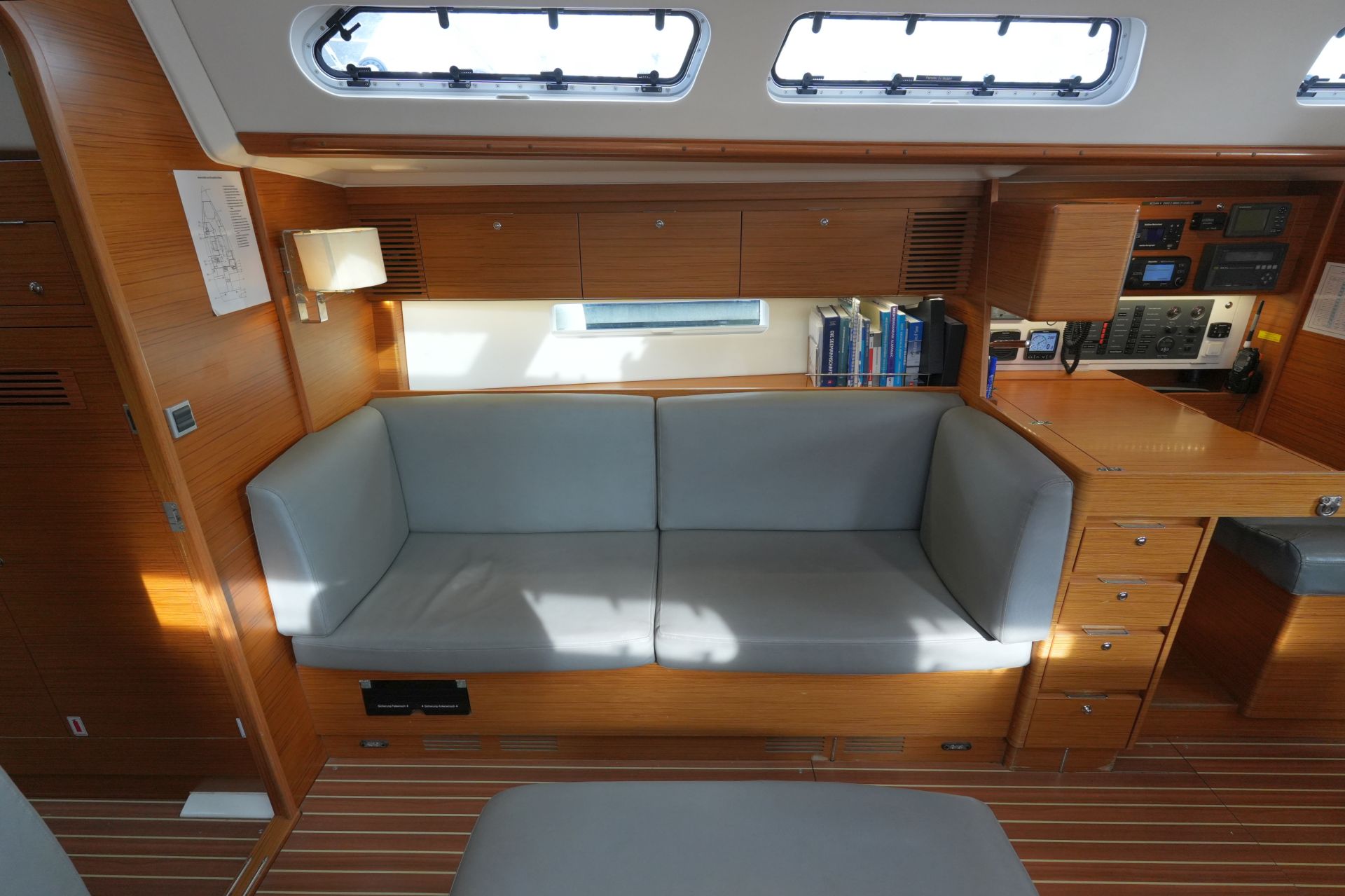 - In Fahrtrichtung eingebauter Kartentisch mit Navigatorsitz an Steuerbord achtern