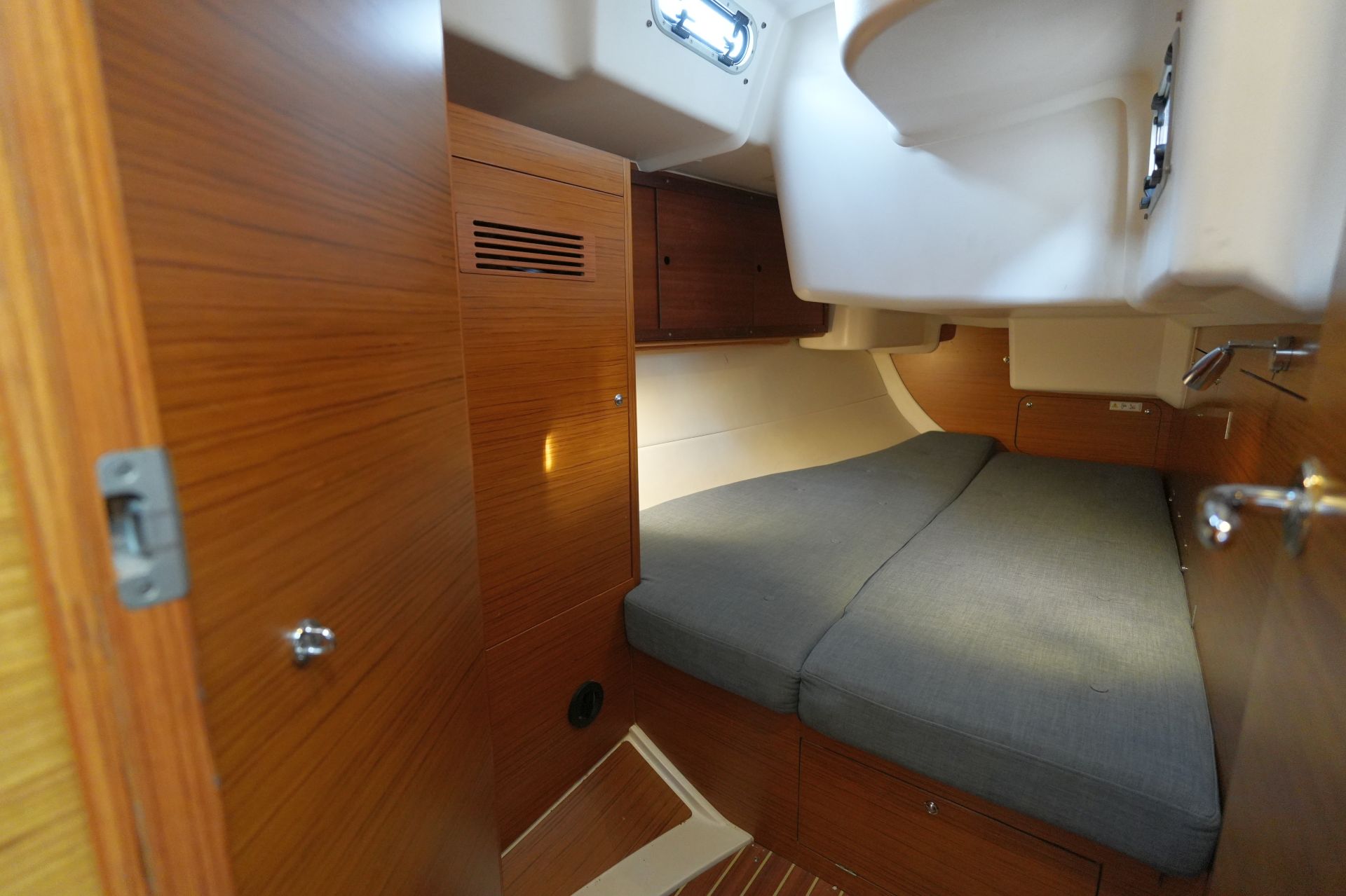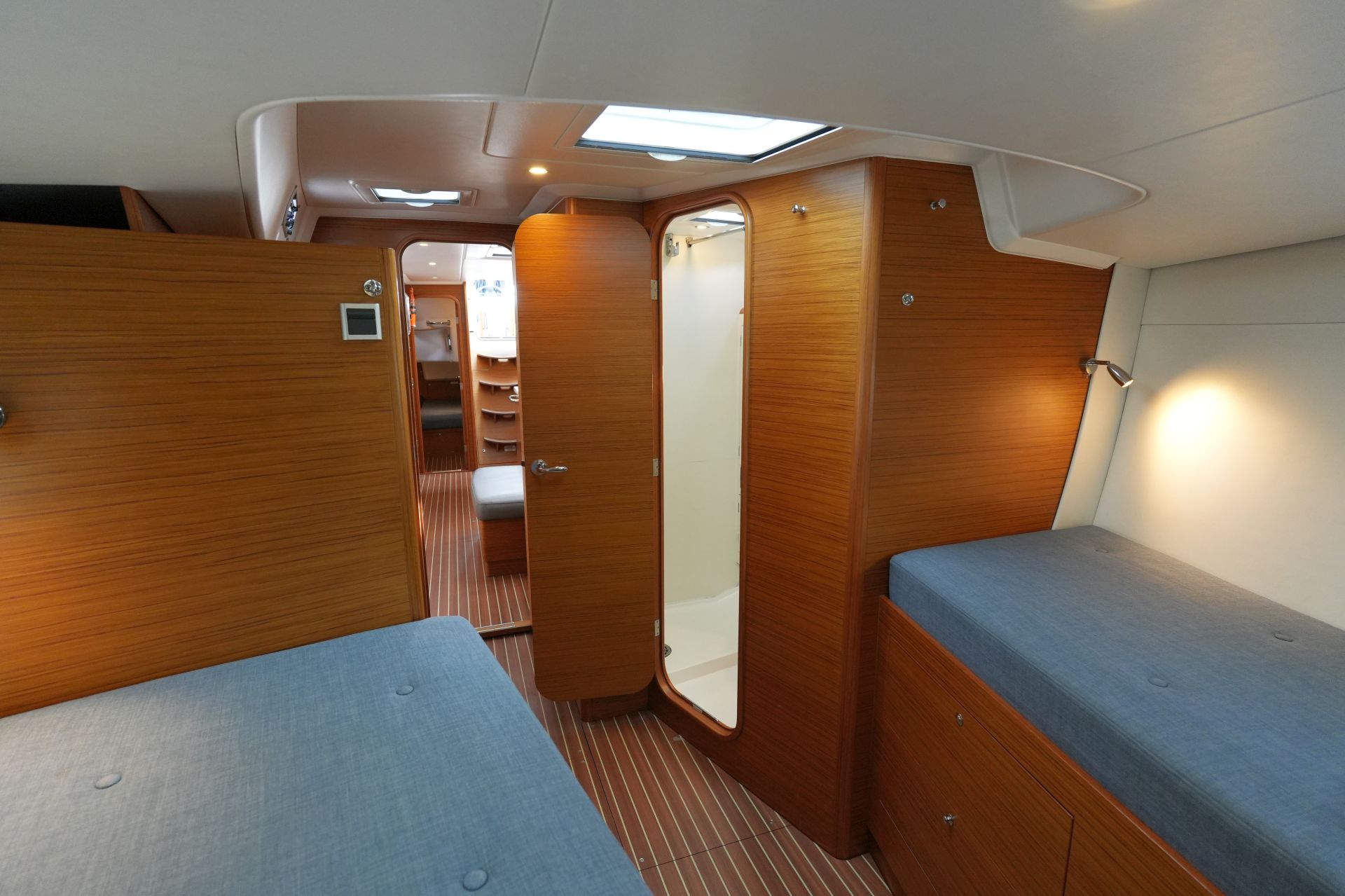 - Zwei symmetrische Achterkabinen mit Doppelkoje, Schrank sowie zwei Bullaugen und einer Decksluke