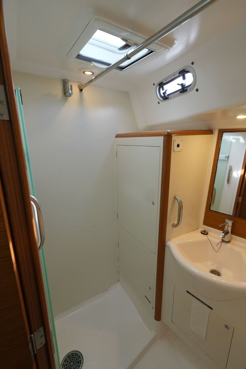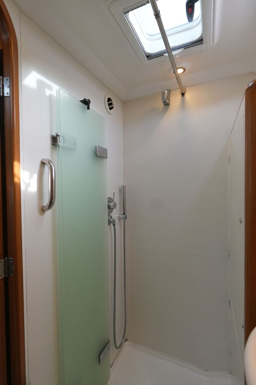 - Nasszelle an Backbord vorn mit Waschbecken, elektrischer Toilette und abtrennbarer Dusche