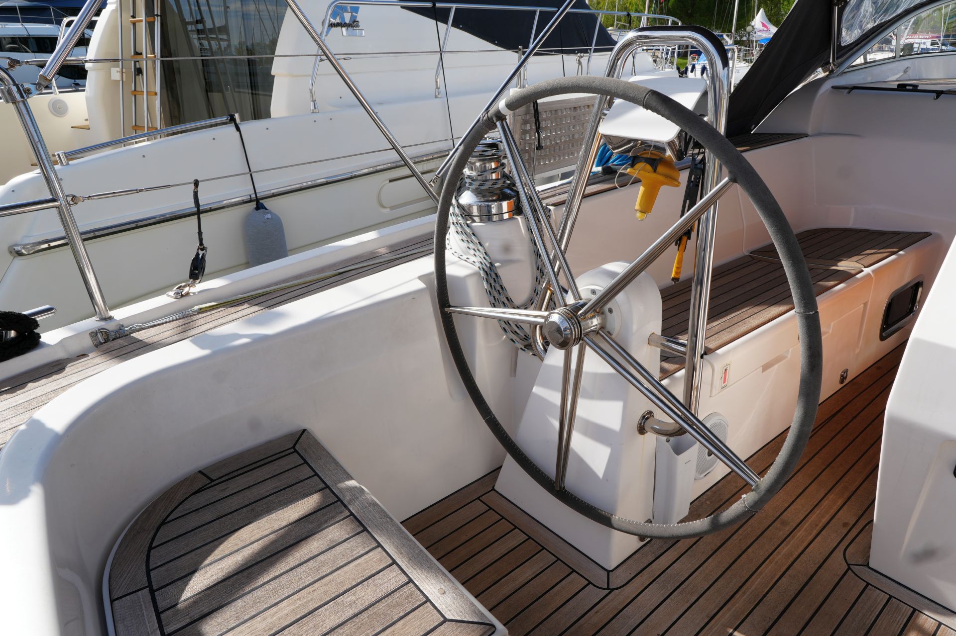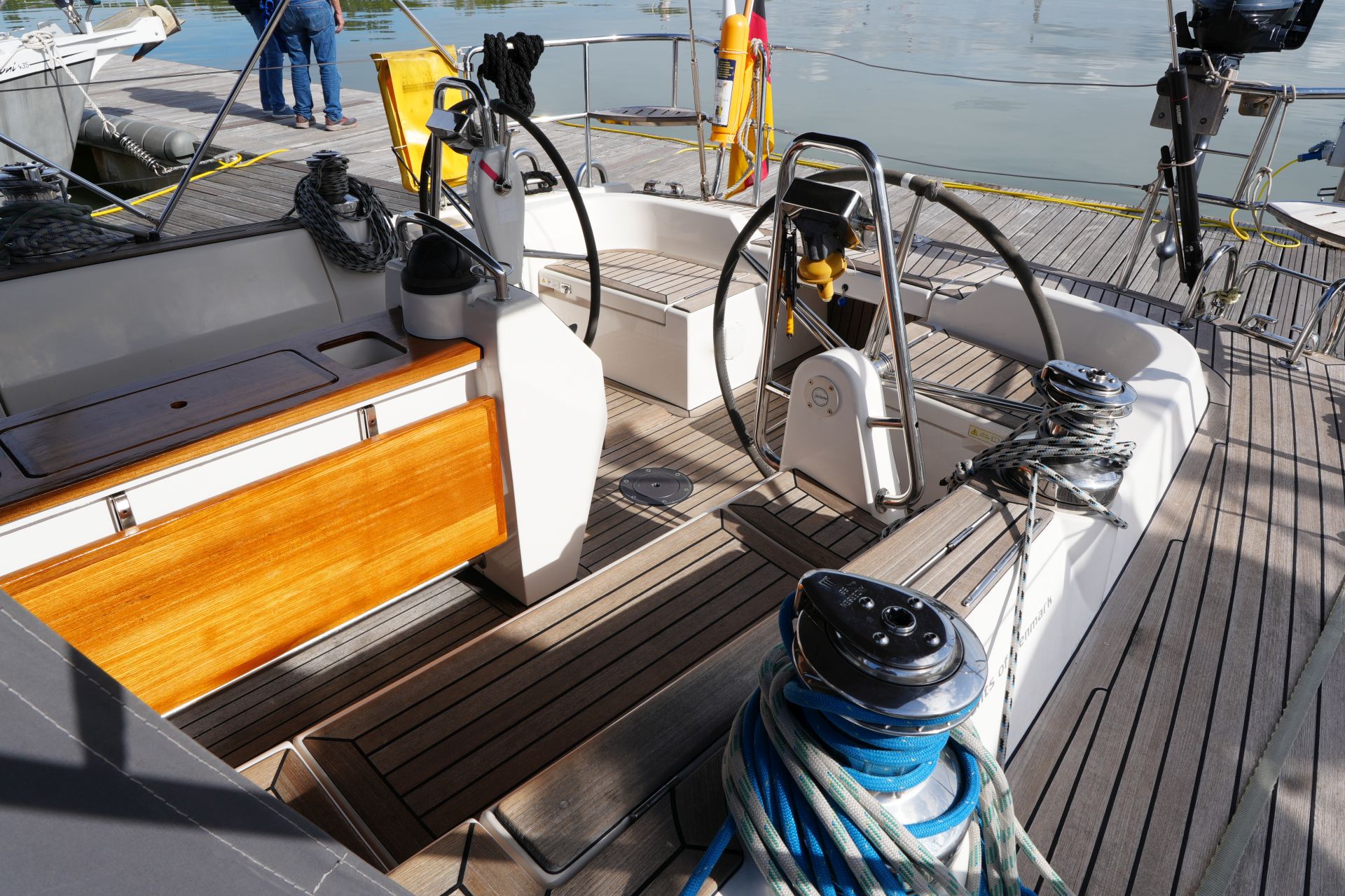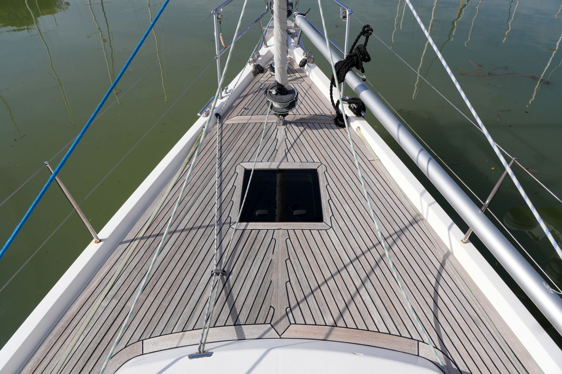 - Teakdeck auf Vorschiff, Seitendecks, Badeplattform, Aufbaudach hinter Windschutzscheibe und im Cockpit