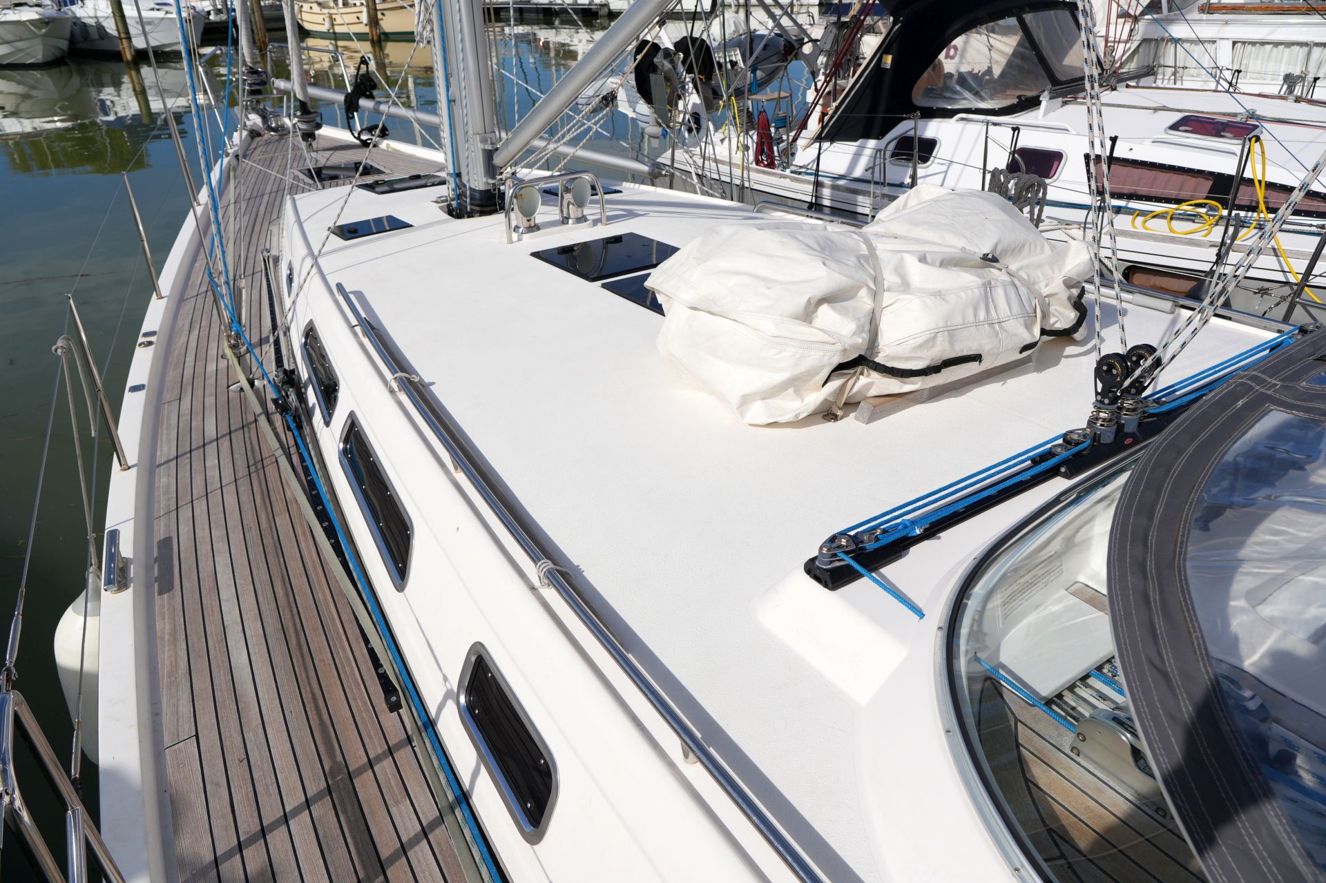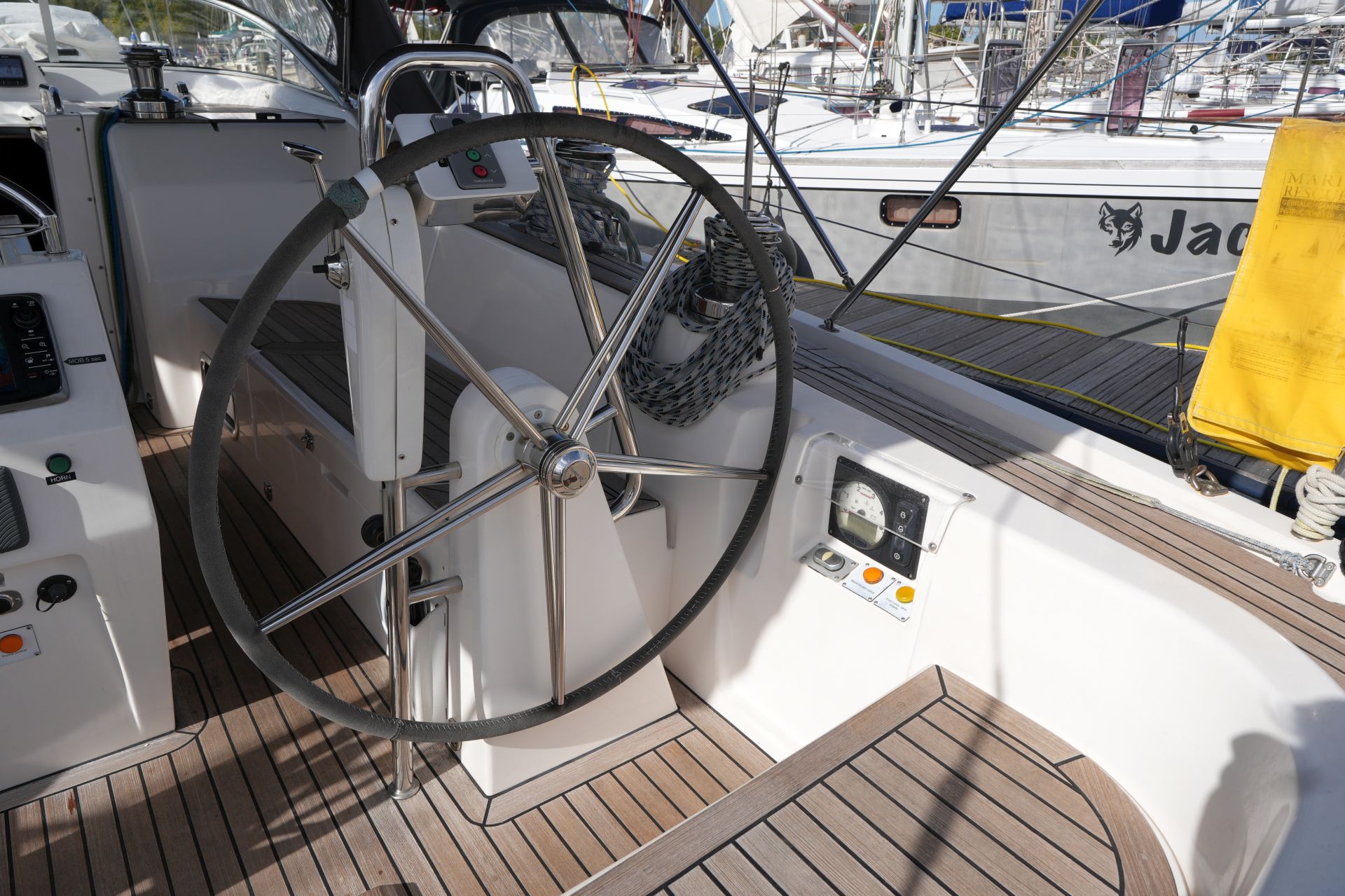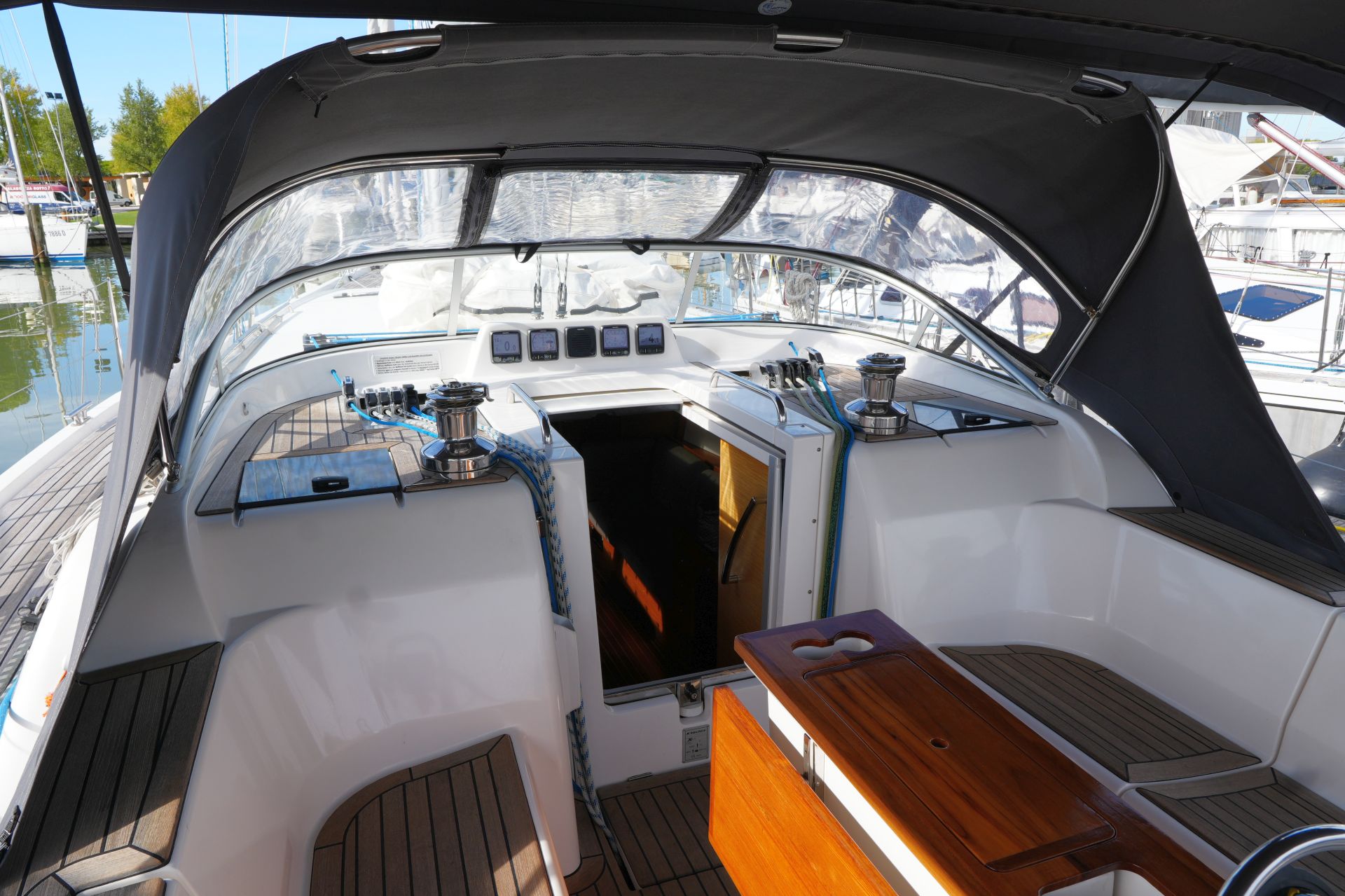 - Teakdeck auf Vorschiff, Seitendecks, Badeplattform, Aufbaudach hinter Windschutzscheibe und im Cockpit