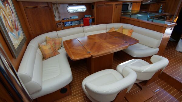 - U-förmige Dinette und zwei zentrale Einzelsessel am klappbaren Salontisch an Steuerbord