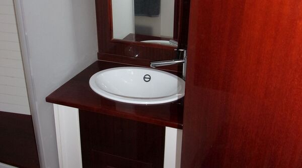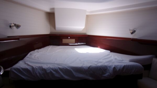 Moody AC 41 in Eignerversion mit zwei Kabinen und hochglanzlackiertem Mahagoni-Ausbau. Geräumiger Salon mit Dinette an Steuerbord um den Salontisch und zwei Sesseln an Backbord mit kombiniertem Kartentisch/Kaffeetisch (Salonpolster in Leder, Farbton: "Cream"). Eignerkabine im Vorschiff mit freistehendem Mittelbett und zwei Schränken. L-förmige Pantry achtern an Steuerbord mit Arbeitsfläche in CORIAN, großer elektrischer Kühlschrank 130 l, kardanisch aufgehängtem Gasherd (3 Flammen und Ofen) und Doppelspüle. Achterkabine an Steuerbord mit Doppelkoje und Schrank. Nasszelle mit separater Duschkabine an Backbord achtern.