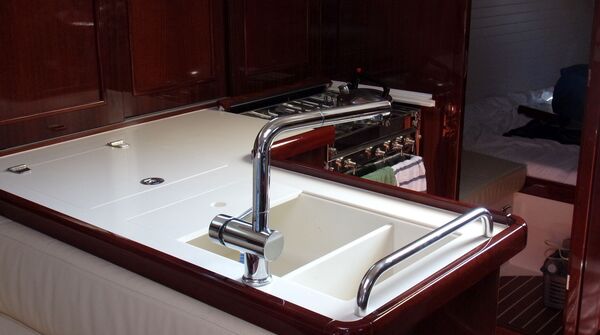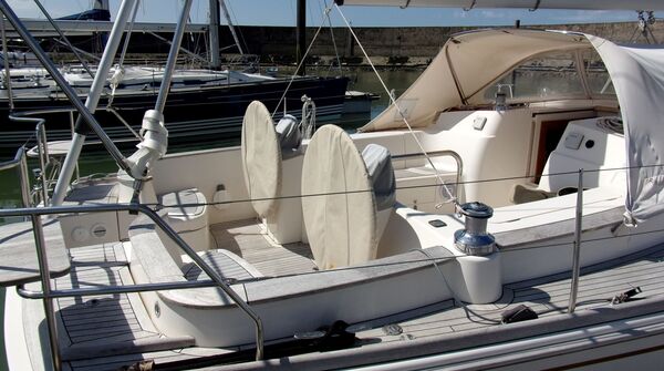 Elektrische Ankerwinde unter Deck mit DELTA Anker und 30 m Kette, ausklappbare Badeplattform mit Teakdeck, Teak auf Seitendecks, im Cockpit und auf Cockpitsüll, Teak Cockpittisch mit Edelstahl Basis und Persenning, Teaksitze im Heckkorb, Sprayhood, Bimini, Teak Scheuerleiste mit Edelstahlprofil am Rumpf, Springklampen, Relingstore Steuerbord und Backbord, Genuawinschen LEWMAR 48.2ST, eine elektrische Fallwinsch LEWMAR 46.2STE an Steuerbord, leinenverstellbare Genua-Holepunkte, Schiene mit Traveller für Selbstwendefock, Heckdusche warm/kalt.