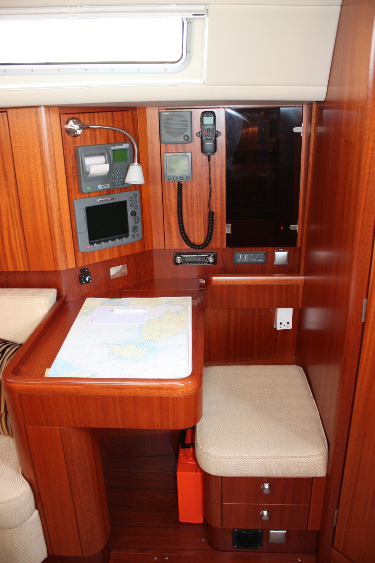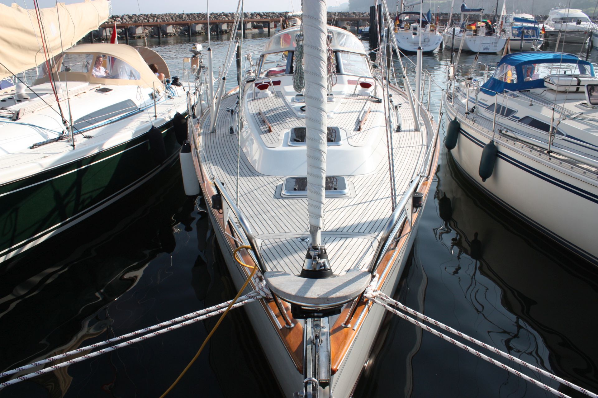 Centercockpityacht aus dem Jahr 2006Seegängiger, sehr gut gepflegter und komplett ausgestatteter Centercockpit-Cruiser von Najadvarvet AB. Exklusives, aufwendiges Handwerk von der traditionellen Bootsbauinsel Orust in den Westschwedischen Schären. Design: judel/vrolijk & co. Die NAJAD 405 hat ein tiefes, geschütztes Mittelcockpit mit fester Windschutzscheibe. Breite Seitendecks mit erhöhtem Süllrand ermöglichen eine sichere Bewegung an Deck. Einhand-taugliches Cockpitlayout, da alle Fallen und Strecker auf die Sekundärwinschen neben dem Steuerstand geführt sind (keine Aufbauwinschen). Heller, liebevoll ausgeführter, aufwendiger Ausbau in Mahagoni und Vinyl-bespannten Panelen. Interior-Design: Rhoades/Young. 2 Kabinen-Layout mit Eignerkabine über die volle Schiffsbreite im Heck. Diese NAJAD 405 hat immer im Deutschen NAJAD-Servicebetrieb im Hallen-Winterlager gelegen und wurde dort regelmäßig gewartet und liebevoll gepflegt.