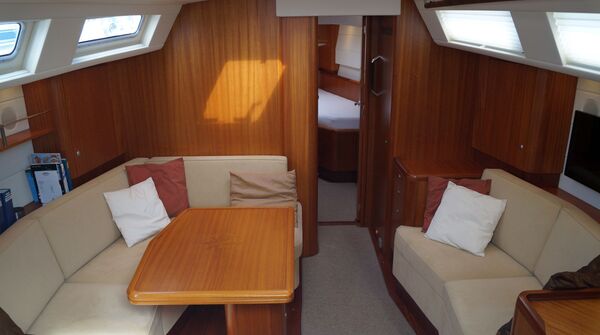 - Salon mit L-förmiger Dinette am klappbaren Salontisch an Backbord und Sofa an Steuerbord