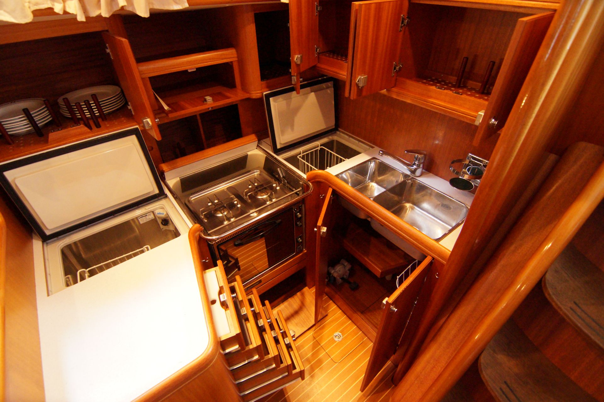 - Geräumige Eignerkabine im Heck mit freistehender Doppelkoje, Sitz, reichlich Stauraum in Schränken, Schubladen und Fächern