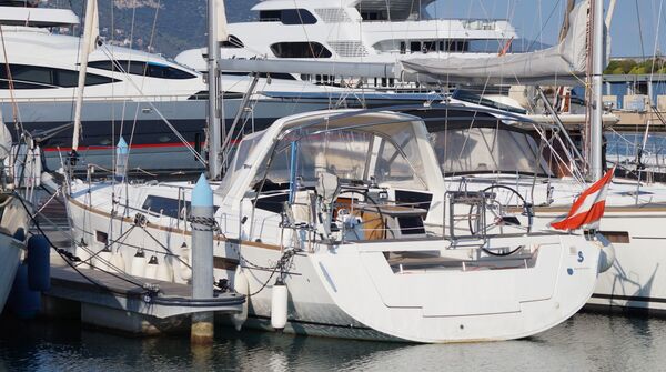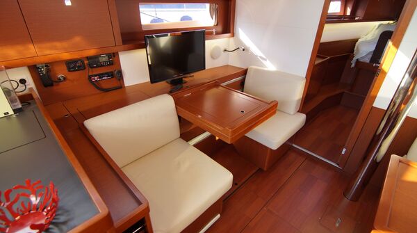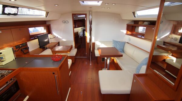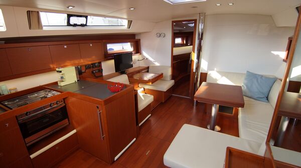 Cruiser aus dem Jahr 2014Komfortabler und umfangreich ausgestatteter Cruiser in Eignerversion von der französischen Großwerft Chantiers BÉNÉTEAU. Die Oceanis 45 bietet in ihrer luxuriösen Eignerkabine, einer luftigen Achterkabine und dem geräumigen, hellen Salon ungewöhnlich viel Lebensraum und Komfort für lange Reisen und ausgedehnte Aufenthalte an Bord. Reichlich Luft und Licht unter Deck dank zahlreicher Rumpffenster, Bullaugen, Decksluken, und der großen Aufbauscheiben. Auch an Deck zeigt sich die Oceanis modern und aufgeräumt. Das ungewöhnlich große Cockpit mit zwei Steuerständen und freiem Zugang zum Achterdeck und der breiten, elektrisch ausklappbaren Badeplattform macht die Oceanis 45 zur perfekten Badeinsel vor Anker und schafft reichlich Bewegungsfreiheit bei Manövern unter Segel. Dabei wird das Cockpit dank des GFK Targabügels von der Großschot freigehalten.