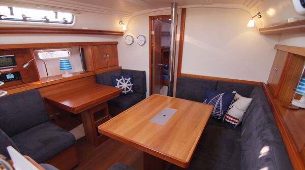 - Geräumiger Salon mit U-förmiger Dinette am Salontisch an Steuerbord
