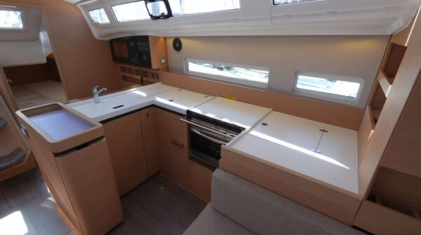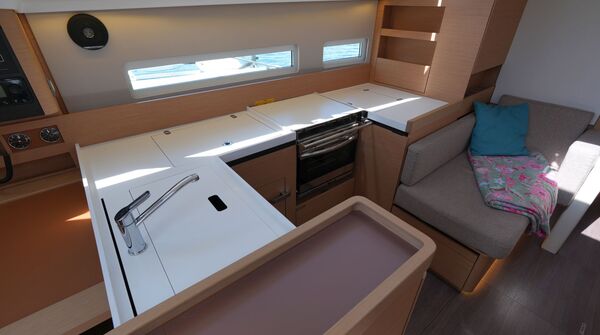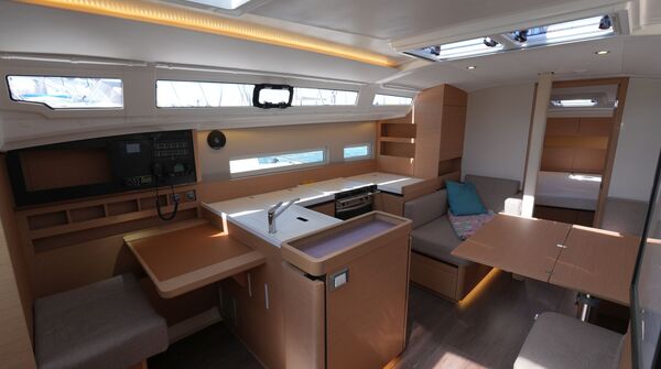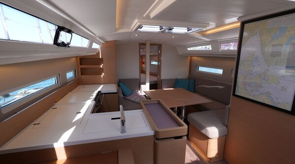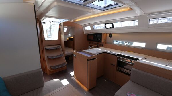 Segelyacht aus dem Jahr 2020Komfortabler, geräumiger Cruiser von der französischen Großwerft Chantiers Jeanneau. Die Sun Odyssey 410 bietet bei handlicher Größe ein Höchstmaß an Platz und Lebensraum für bis zu sechs Passagiere. Modernes Rumpfdesign mit hohem Leistungspotential vom Class 40-Spezialisten Marc Lombard mit breitem Heck mit Chines, negativem Bugsteven zur Verlängerung der Wasserlinie und voluminösem Vorschiff mit senkrechten Bordwänden. Besonderes Merkmal dieser Baureihe von Jeanneau ist das "Walkaround-Cockpit": Die Seitendecks sind stolperfrei und ohne Stufe vom Cockpit aus erreichbar. Der tiefe L-förmige Kiel und die breite Wasserlinie in der Hecksektion sorgen für reichlich Aufrichtendes Moment und verleihen der Sun Odyssey 410 zusammen mit der Doppel-Ruderanlage sichere, gutmütige Segeleigenschaften. Reichlich Luft und Licht unter Deck durch zahlreiche, große Rumpffenster, Aufbaufenster, Decksluken, Bullaugen, Panoramafenster und die in Plexiglass ausgeführten Niedergangs-Schotten.