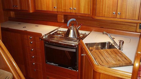 Zwei Kabinen-Layout mit geräumiger Eignerkabine im Heck mit Doppelkoje mit Lattenrosten an Steuerbord, Sitz und reichlich Stauraum in Schränken und Fächern. Gästekabine im Vorschiff mit Doppelkoje, Salon mit zwei Salonsofas am klappbaren Salontisch. Längspantry im Durchgang zur Achterkabine mit kardanisch aufgehängtem Gasherd (2 Flamen mit Backofen), Doppelspüle, elektrischer Kühlbox ca. 92 l. Kartentisch in Fahrtrichtung eingebaut an Steuerbord achtern, dahinter die Nasszelle.