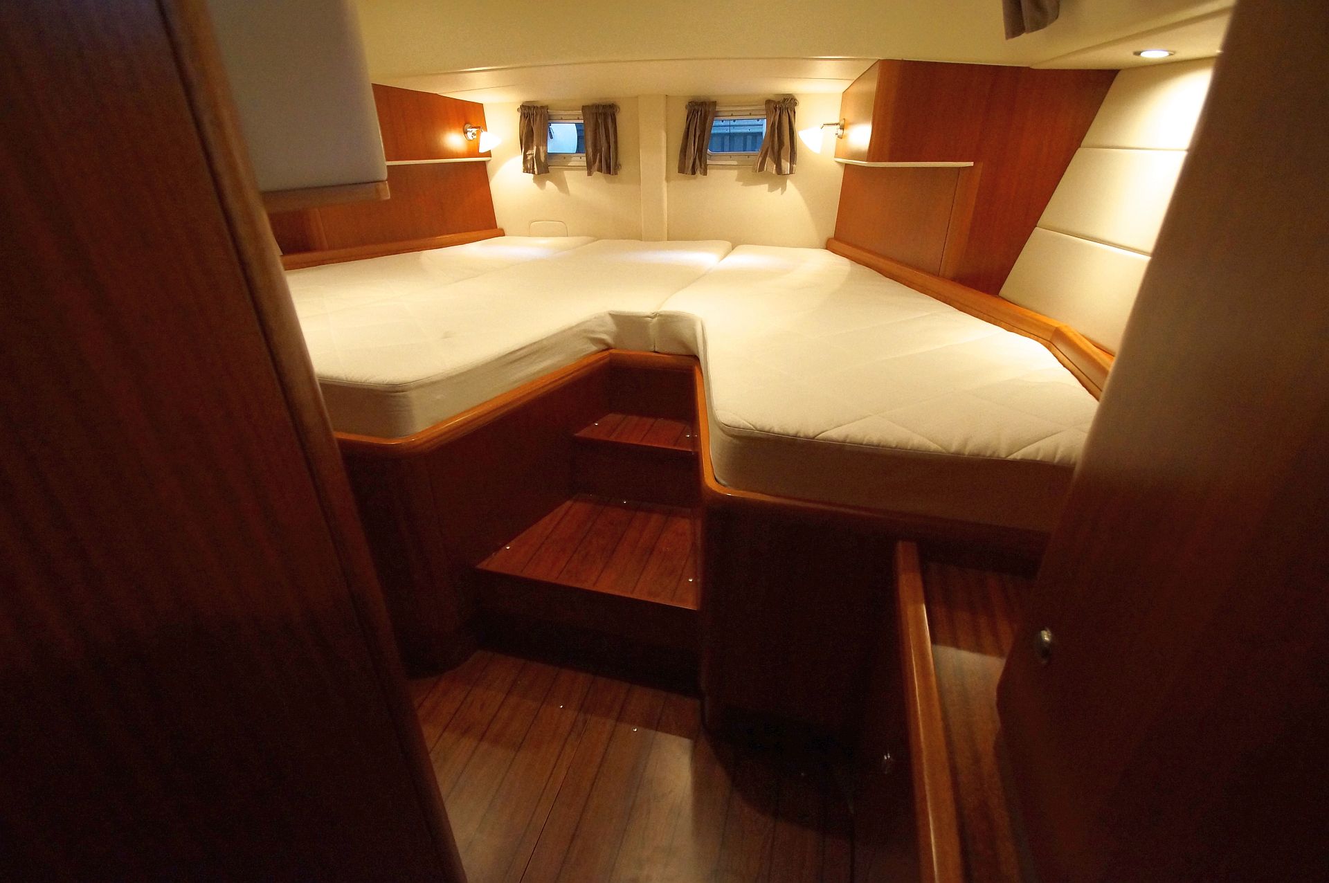 - Geräumige Achterkabine im Heck über die gesamte Schiffsbreite mit Doppelkoje an Steuerbord und Einzelkoje an Backbord und reichlich Stauraum in Schränken, Schubladen und Staufächern
