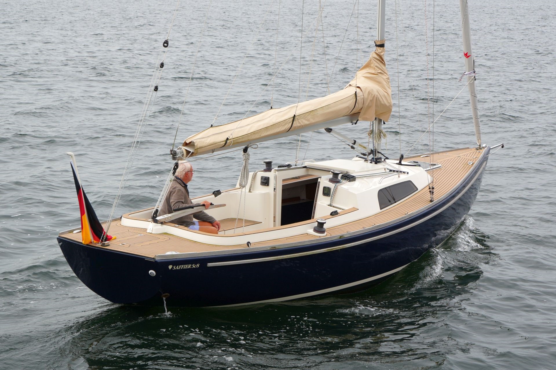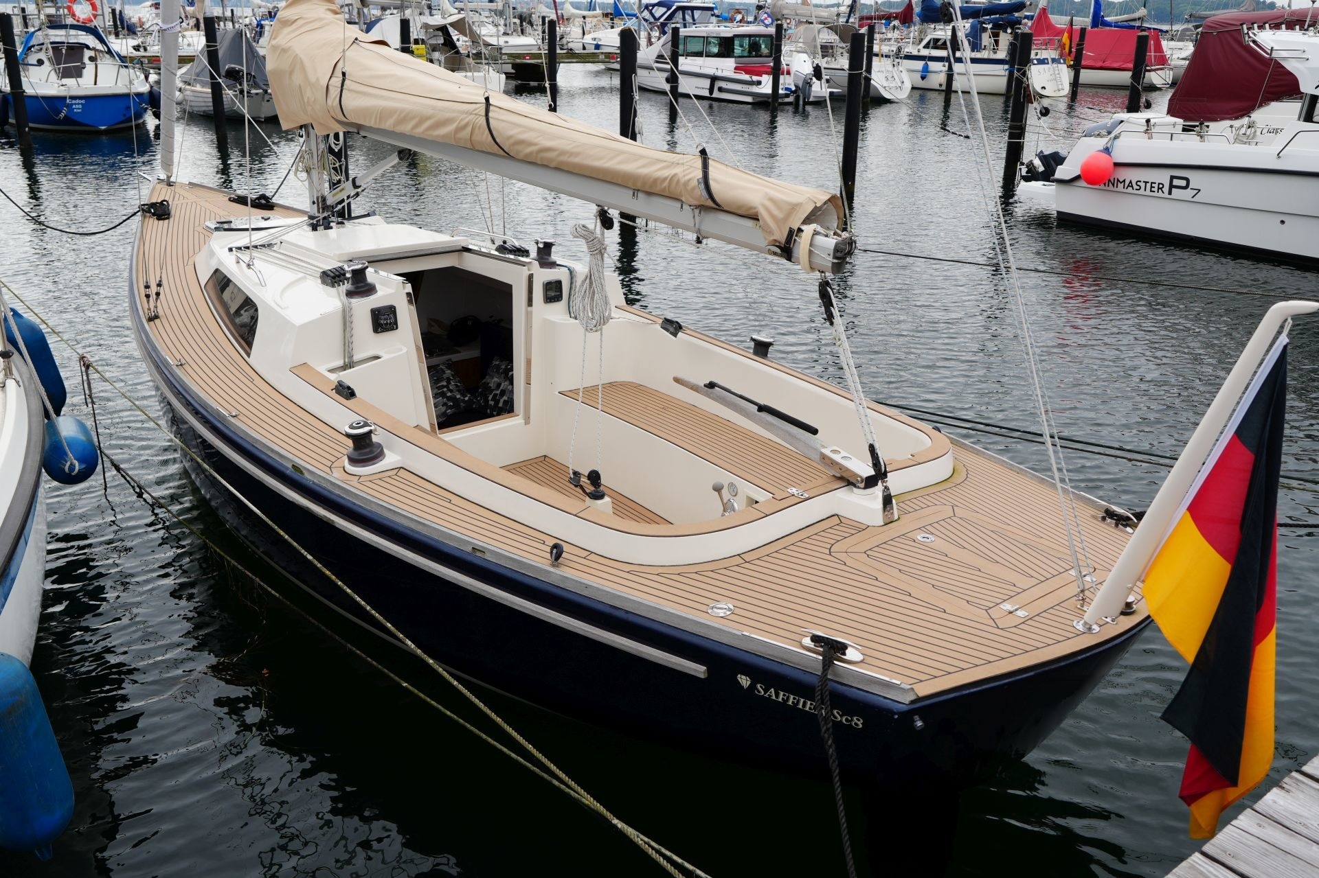 Daysailer aus dem Jahr 2014Exklusiver Daysailer für den entspannten Nachmittag auf dem Wasser und ein sicheres, seegängiges Tourenboot für verlängerte Wochenendtörns - die Saffier SC 8m Cabin ist ein Allround-Talent. Das Schiff ist auf Einhand-Segeln und einfaches Handling ausgelegt. Ein ergonomisches Deckslayout, die Selbstwendefock und die gut beherrschbare Größe ermöglichen entspanntes, sicheres Segeln ohne Crew. Trotzdem ist im geräumigen Cockpit Platz für Gäste und ein komfortables, hohes Süll bietet Schutz bei ungemütlichen Bedingungen. Unter Deck ist die Saffier SC 8m Cabin überraschend groß: Das für einen Daysailer ungewöhnlich geräumige Interieur bietet Platz für eine Doppelkoje vorn, zwei Einzelkojen achtern und einen Pantry-Block mit Kocher und Waschbecken. Weitere Informationen zu dem Daysailer gibt es hier auf unserer Website: Saffier SC 8m Cabin.