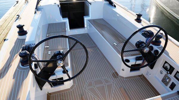 - Zwei schwarze Steuersäulen mit schwarz lackierten GFK-Steuerrädern