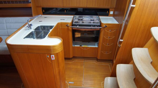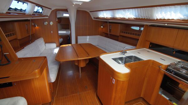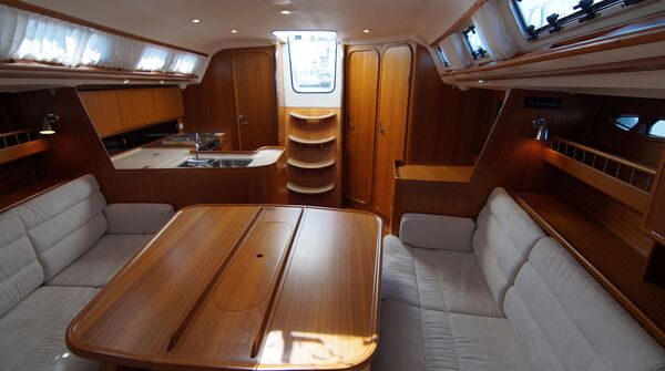 Blauer Rumpf mit weißen Streifen. 3 Kabinen-Layout mit Teak-Ausbau und "Classic Interieur" (L-Pantry an Steuerbord und Längssofas am Salontisch). Teakdeck überall, ausfahrbares Bugstrahlruder und komplette RAYMARINE Navigationselektronik inkl. zwei Plotter, Radar und AIS. Gepflegtes, gut ausgerüstetes Eignerschiff, das im Jahre 2012 durch das Refit bei X-Yachts gegangen ist (Unterwasseranstrich komplett neu aufgebaut, neue Elektronik, neue Polster, neue Persenninge, neues Laufendes Gut, neuer Herd, neue Kaltschaum Matratzen in Eignerkabine, neues Radio). Jedes Jahr im Hallen-Winterlager und laufende Pflege und technische Wartung.