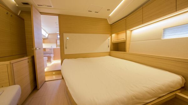 Achterkabine mit Doppelkoje, Sitzbank, Schrank und Stauraum in Staufächern unter der Koje und in Fächern und Ablagen an der Bordwand. -