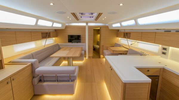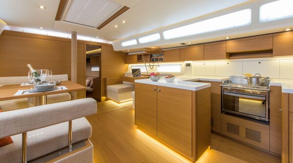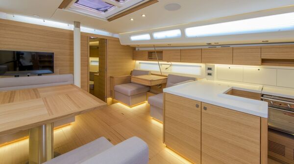 Die Grand Soleil 52 LC ist aufwendig in heller Eiche (seidenmatt lackiert) und in weiß lackierten Paneelen ausgebaut, Decken- und Seitenverkleidungen in weiß bezogenen Paneelen. Eiche-furniertes Bootsbausperrholz und alle Leisten, Rundungen und Rahmen in massiven Eichen-Profilen. Bodenbretter mit Eichenfurnier. Optional kann die Grand Soleil 52 LC in Teak ausgebaut werden. Magnetstopper für Türen, Gasdruckdämpfer für Schranktüren, Schlingerleisten für Regale und Ablagen. -