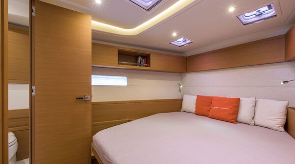 Die Eignerkabine im Vorschiff der Grand Soleil 52 LC bietet eine breite, freistehende Doppelkoje mit Kopfende in Fahrtrichtung vorne, Sitzbank mit Staufach darunter, Doppelschrank (Hängeschrank und Regale) und Stauraum in zwei Schubladen und Staufächern unter der Koje und in Hängeschränken und Ablagen an den Bordwänden. Optional ist die Grand Soleil 52 LC mit Eignerkoje auf der Backbordseite verfügbar. Eignerbad an Backbord vor dem Hauptschott: Waschbecken mit Mischbatterie, Marine-WC (inkl. Fäkalientank), Schrank und separate, abtrennbare Dusche mit Plexiglas-Türen, Duschsumpf und automatischer Sumpfpumpe. -